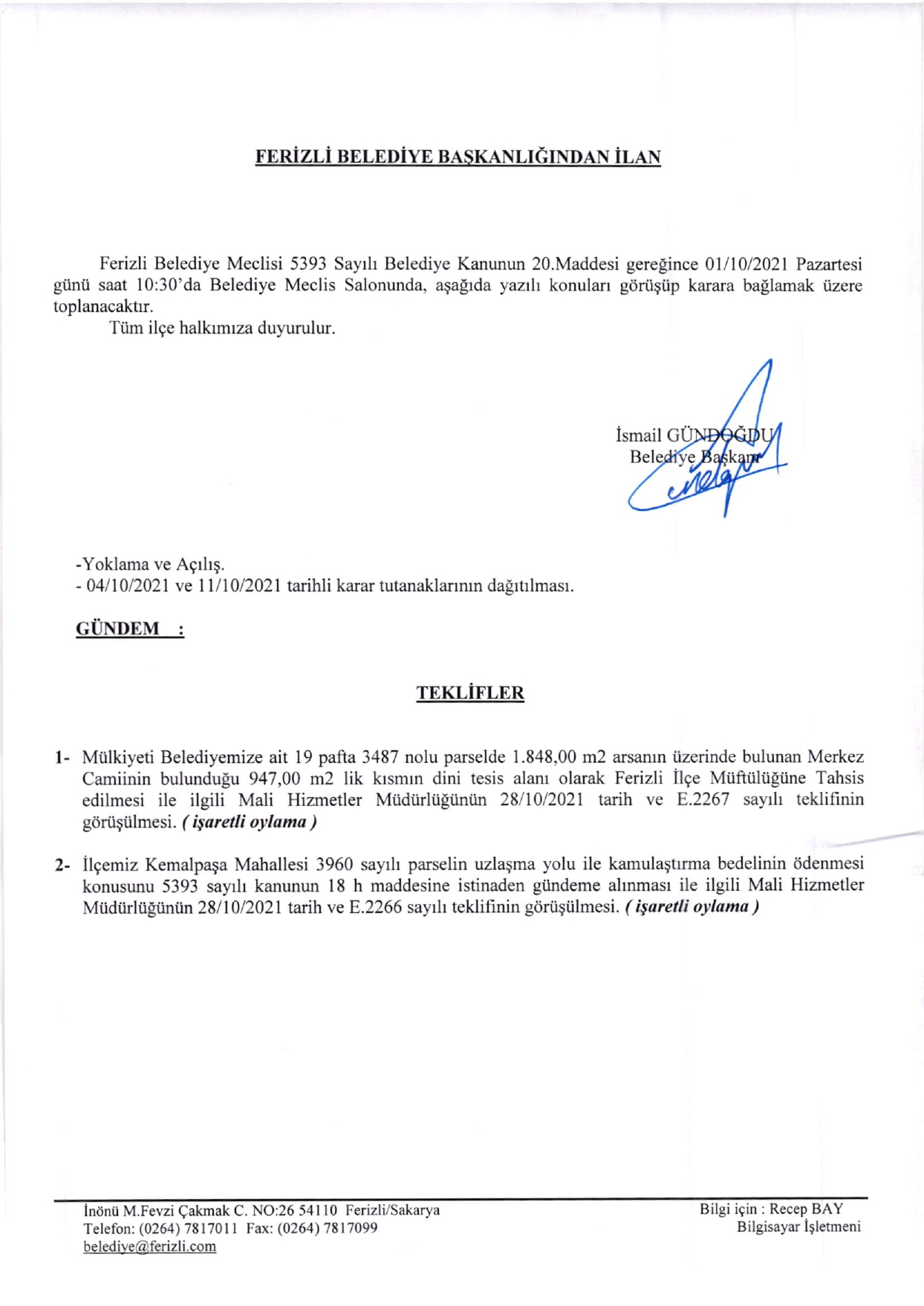 Ferizli Belediyesi Kasım Ayı Meclis Gündemi (01.11.2021 Pazartesi)