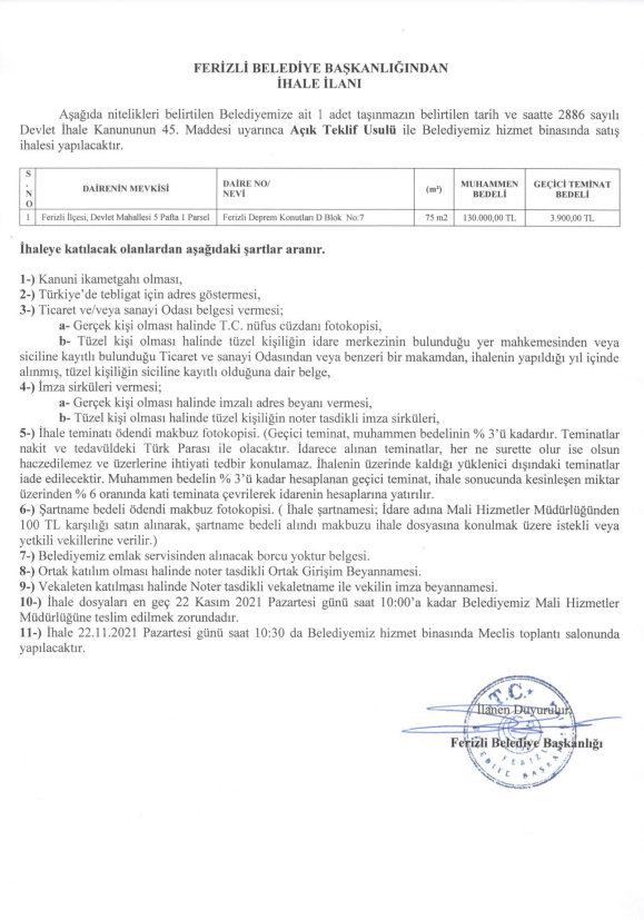 FERİZLİ BELEDİYESİ İHALE İLANI