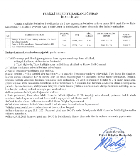FERİZLİ BELEDİYESİ İHALE İLANI