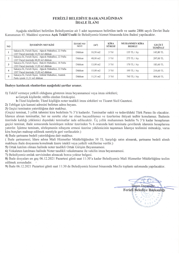 FERİZLİ BELEDİYESİ İHALE İLANI