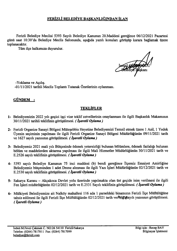 Ferizli Belediyesi Aralık Ayı Meclis Gündemi (06.12.2021 Pazartesi)