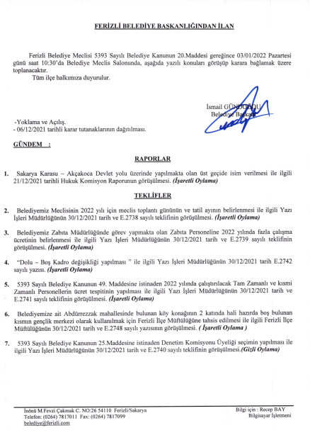 Ferizli Belediyesi Ocak Ayı Meclis Gündemi (03.01.2021 Pazartesi)