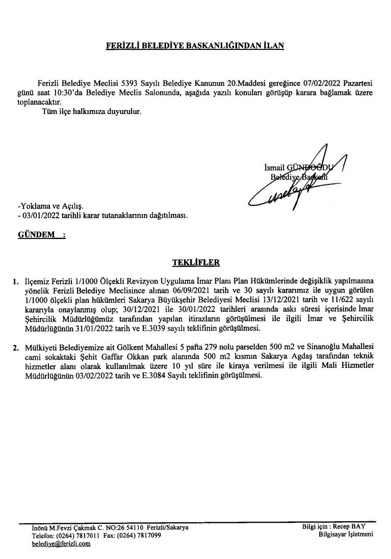 Ferizli Belediyesi Şubat Ayı Meclis Gündemi (07.02.2022 Pazartesi)