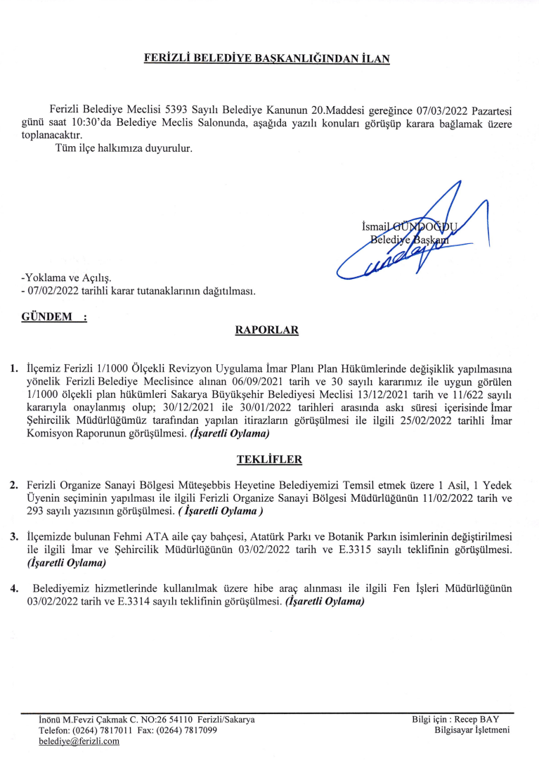 Ferizli Belediyesi Mart Ayı Meclis Gündemi (07.03.2022 Pazartesi)