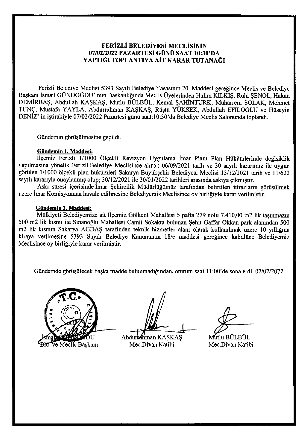 Ferizli Belediyesi Şubat Ayı Meclis Kararları (07.02.2022 Pazartesi)