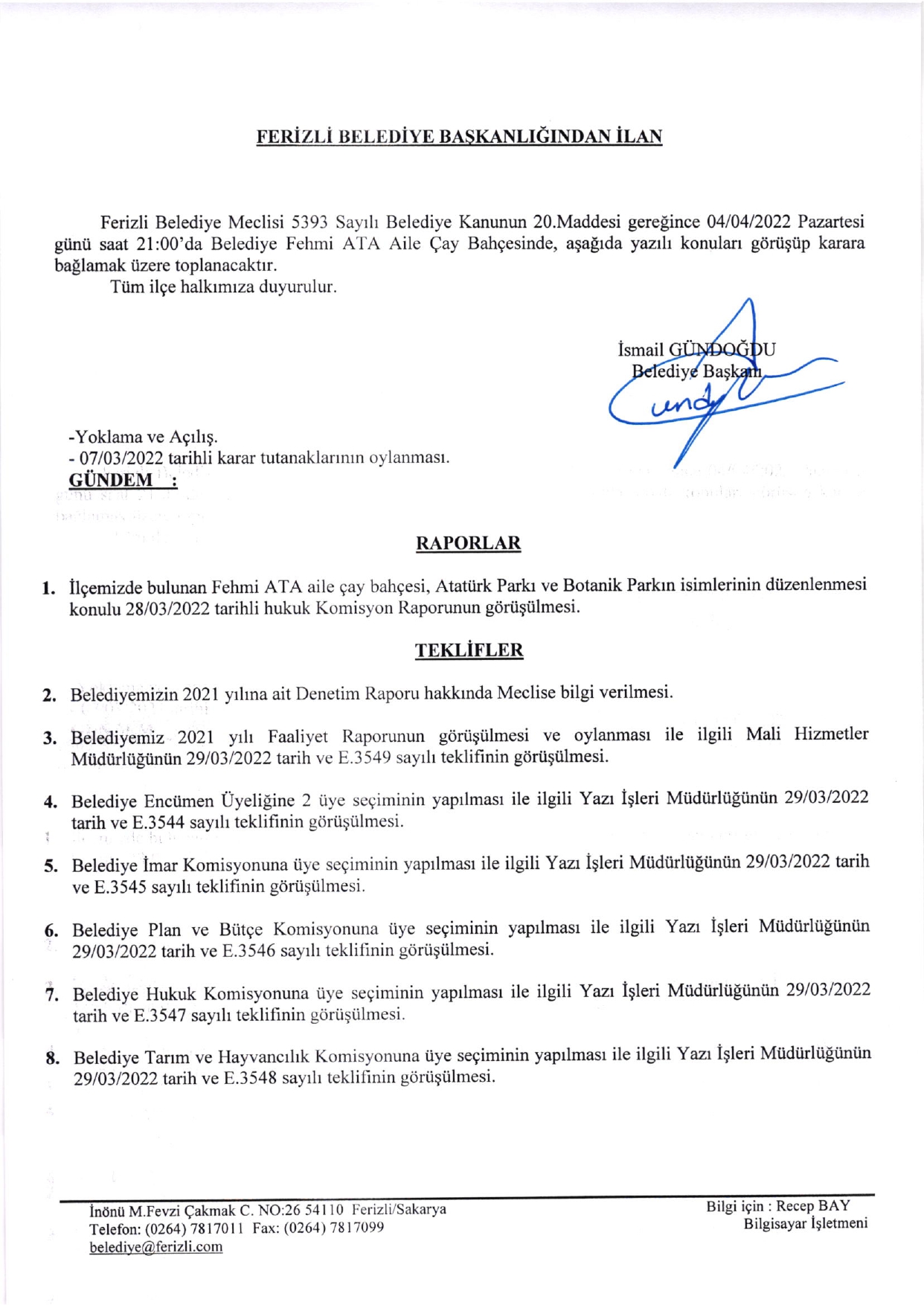 Ferizli Belediyesi Nisan Ayı Meclis Gündemi (04.04.2022 Pazartesi)