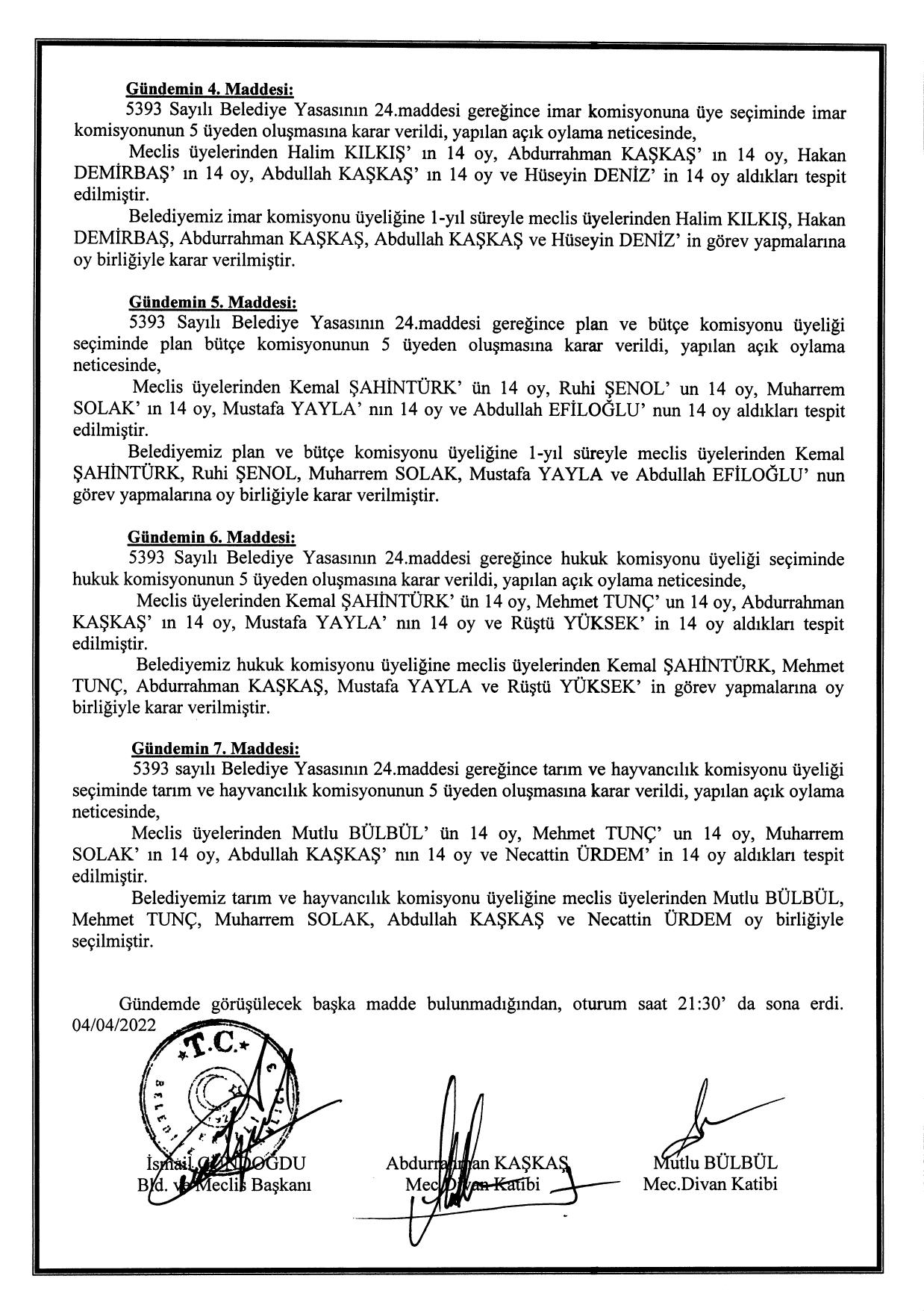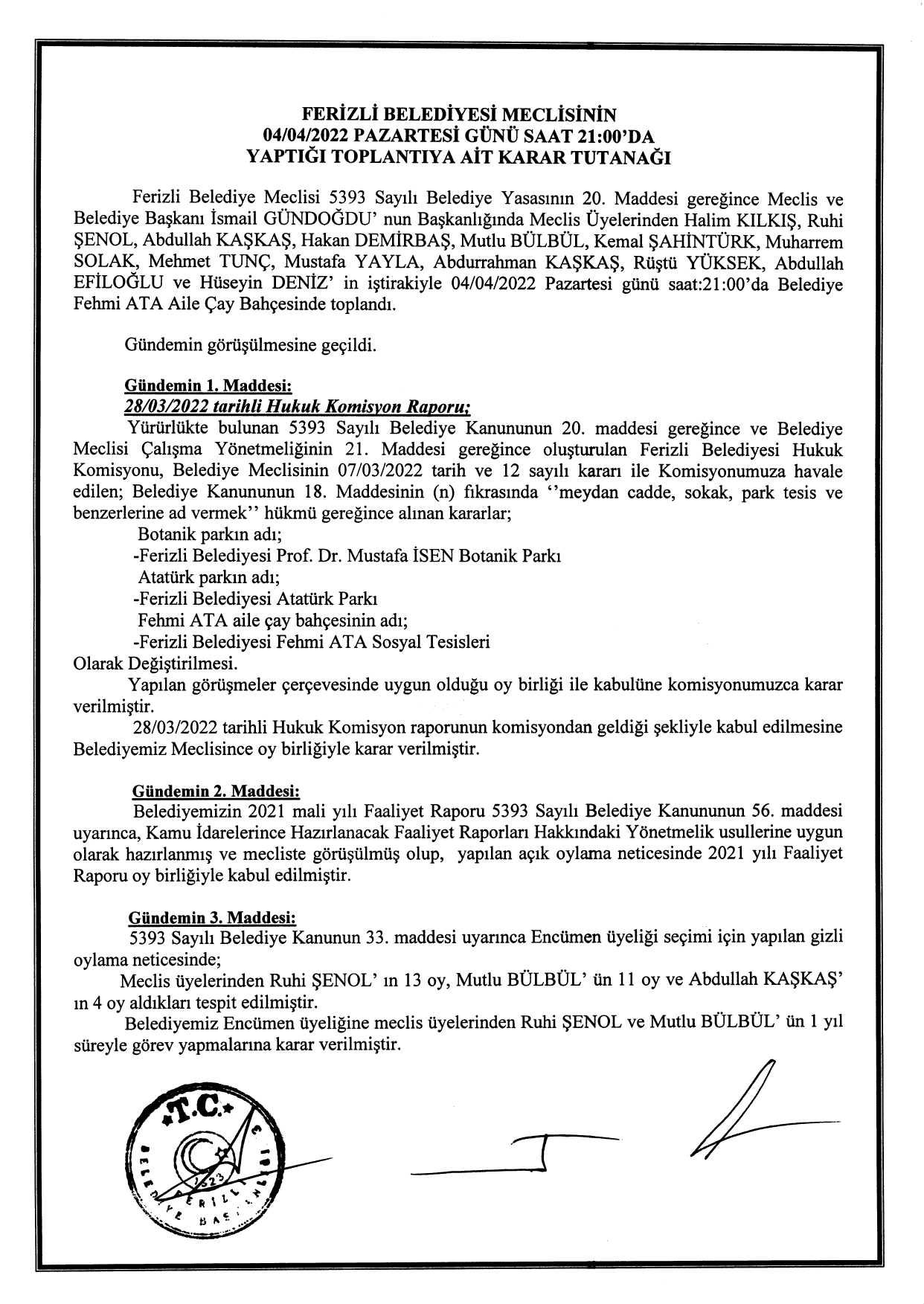 Ferizli Belediyesi Nisan Ayı Meclis Kararları (04.04.2022 Pazartesi)