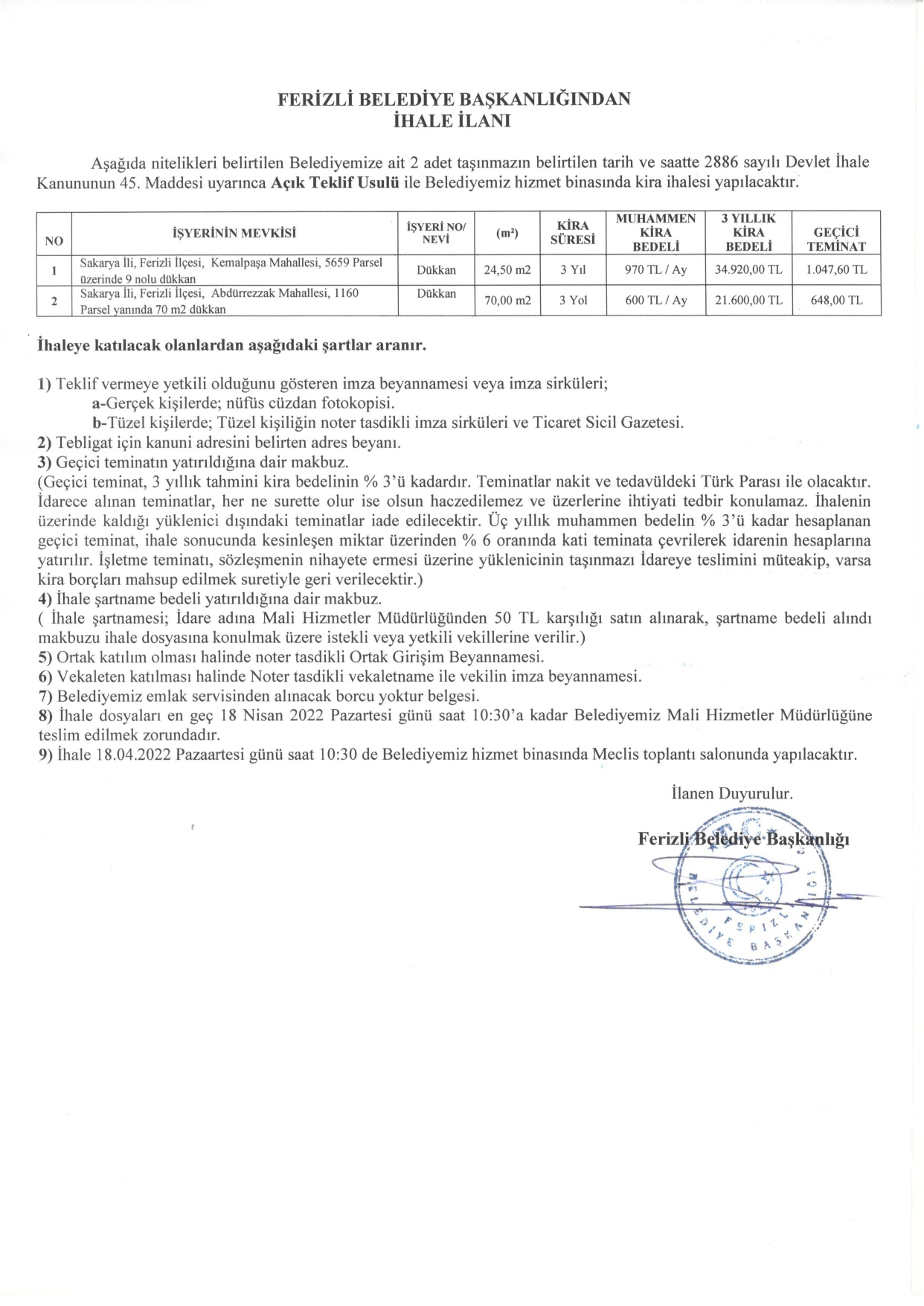 FERİZLİ BELEDİYESİ İHALE İLANI