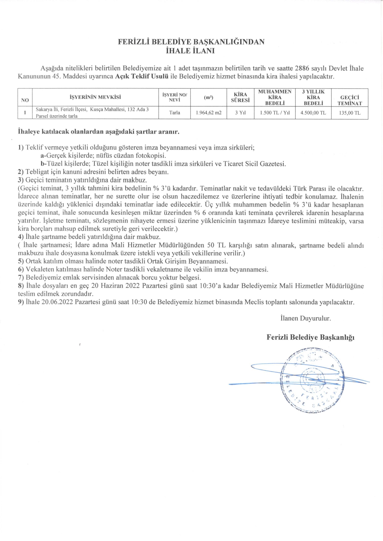 FERİZLİ BELEDİYESİ İHALE İLANI