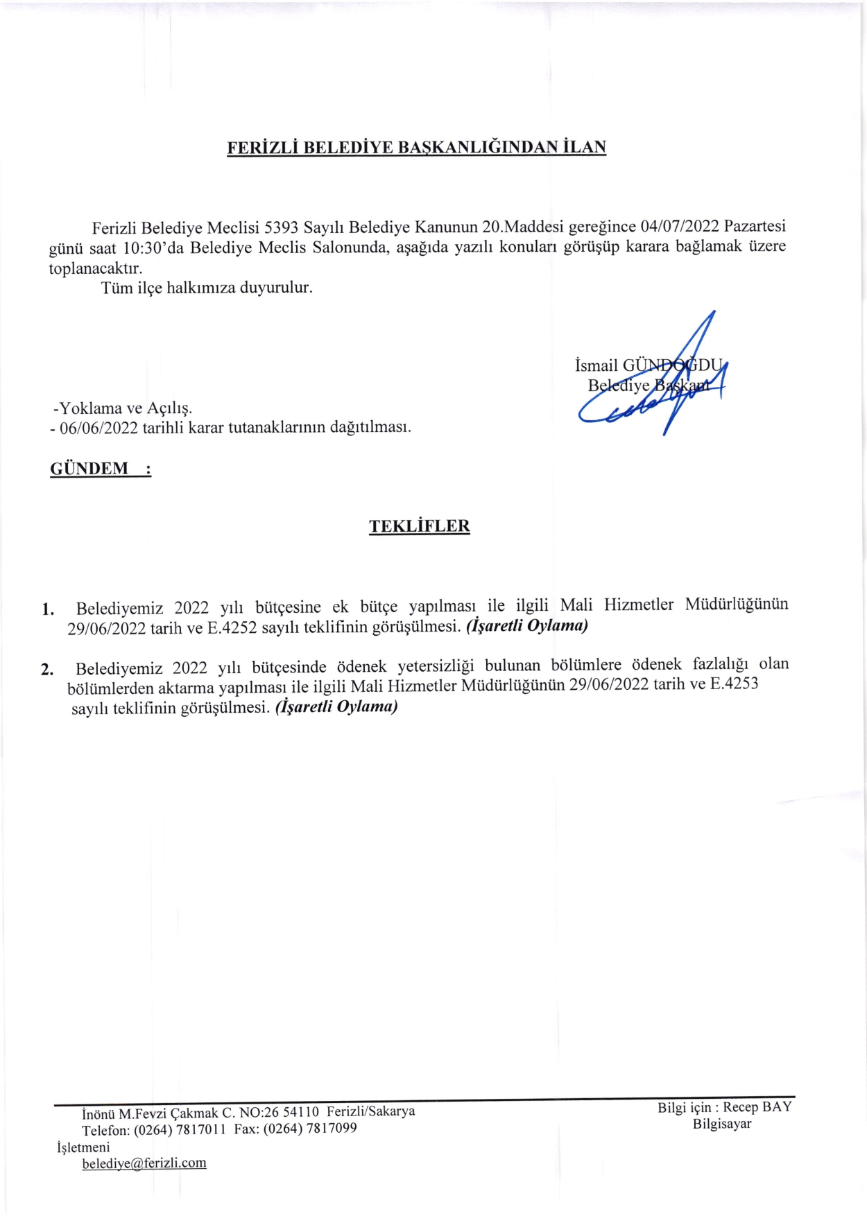 Ferizli Belediyesi Temmuz Ayı Meclis Gündemi (04.07.2022 Pazartesi)