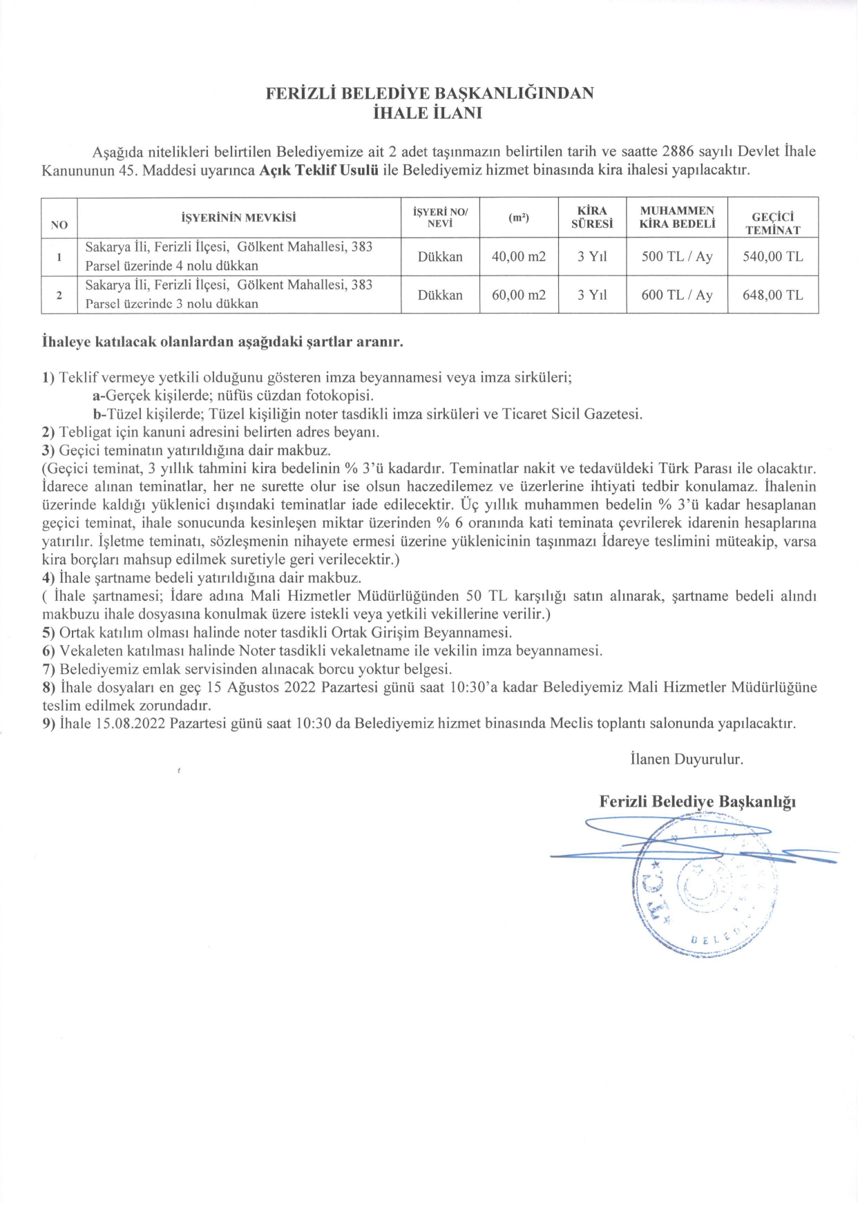 FERİZLİ BELEDİYESİ İHALE İLANI