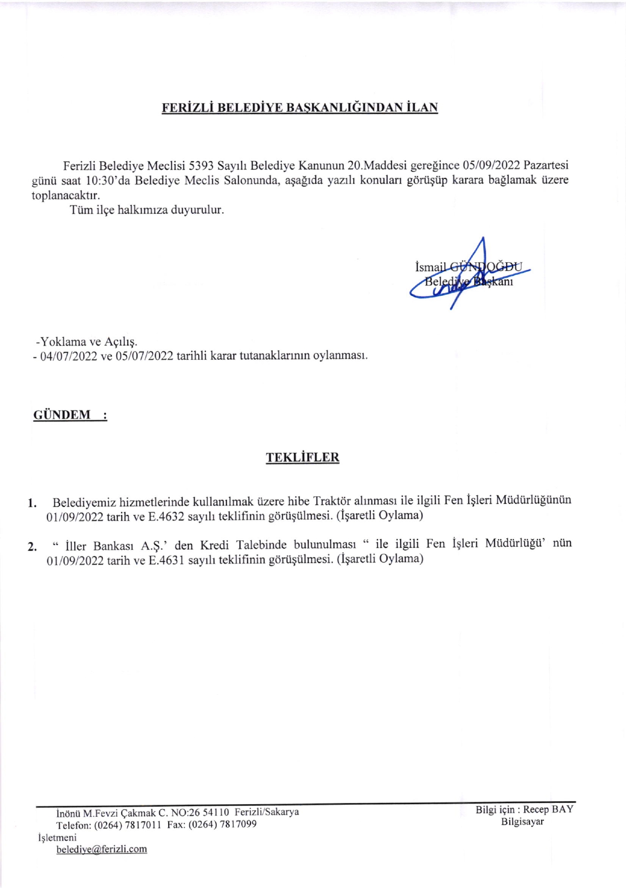 Ferizli Belediyesi Eylül Ayı Meclis Gündemi (05.09.2022 Pazartesi)