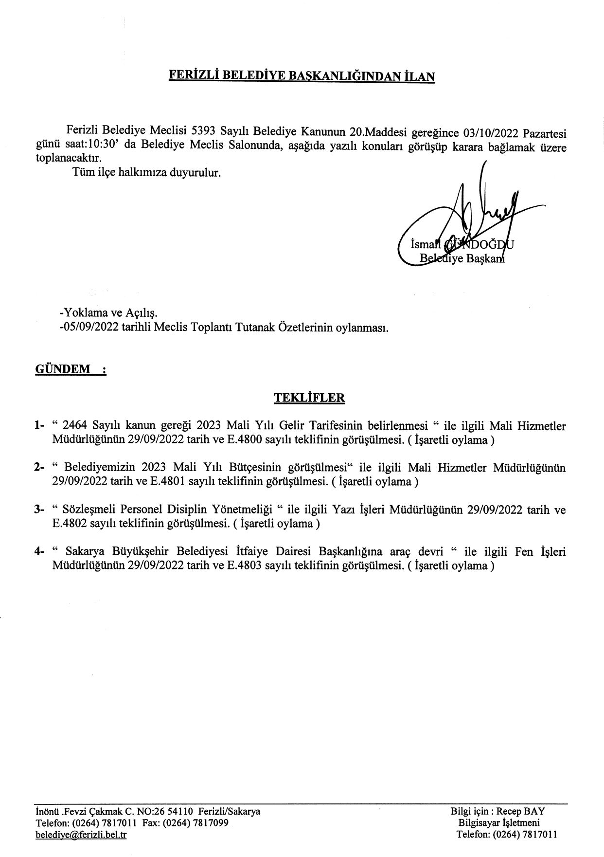 Ferizli Belediyesi Ekim Ayı Meclis Gündemi (03.10.2022 Pazartesi)