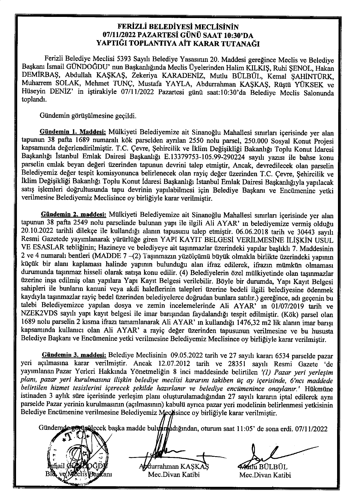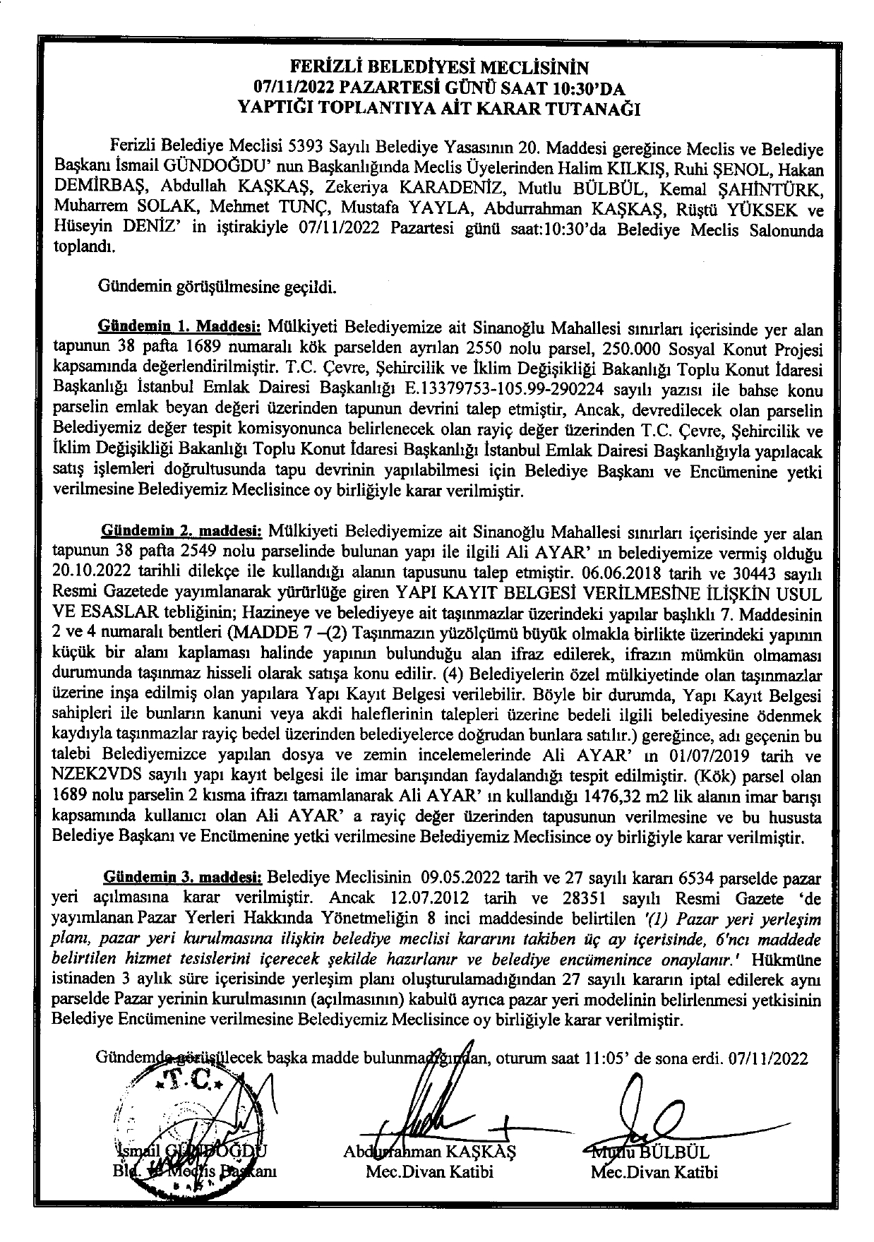 Ferizli Belediyesi Kasım Ayı Meclis Kararları (07.11.2022 Pazartesi)