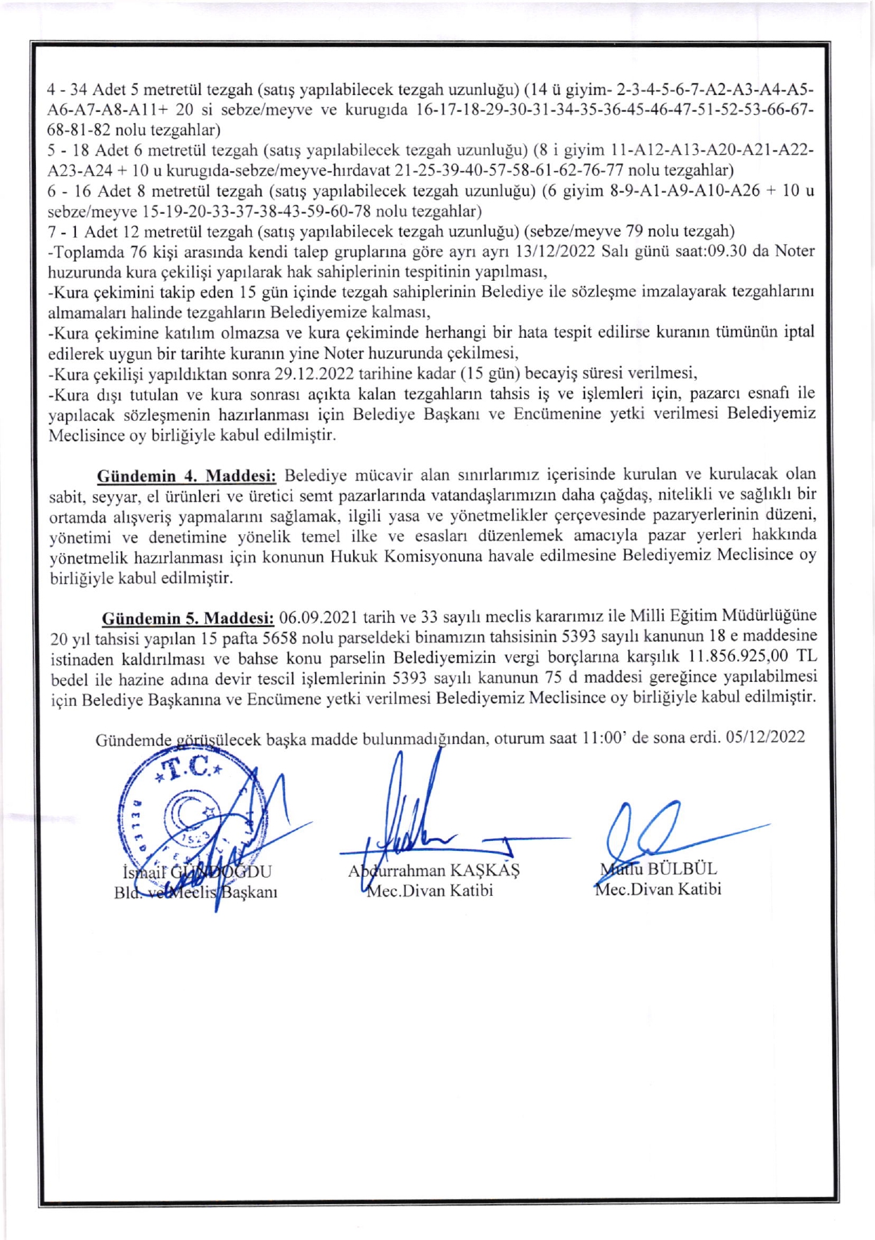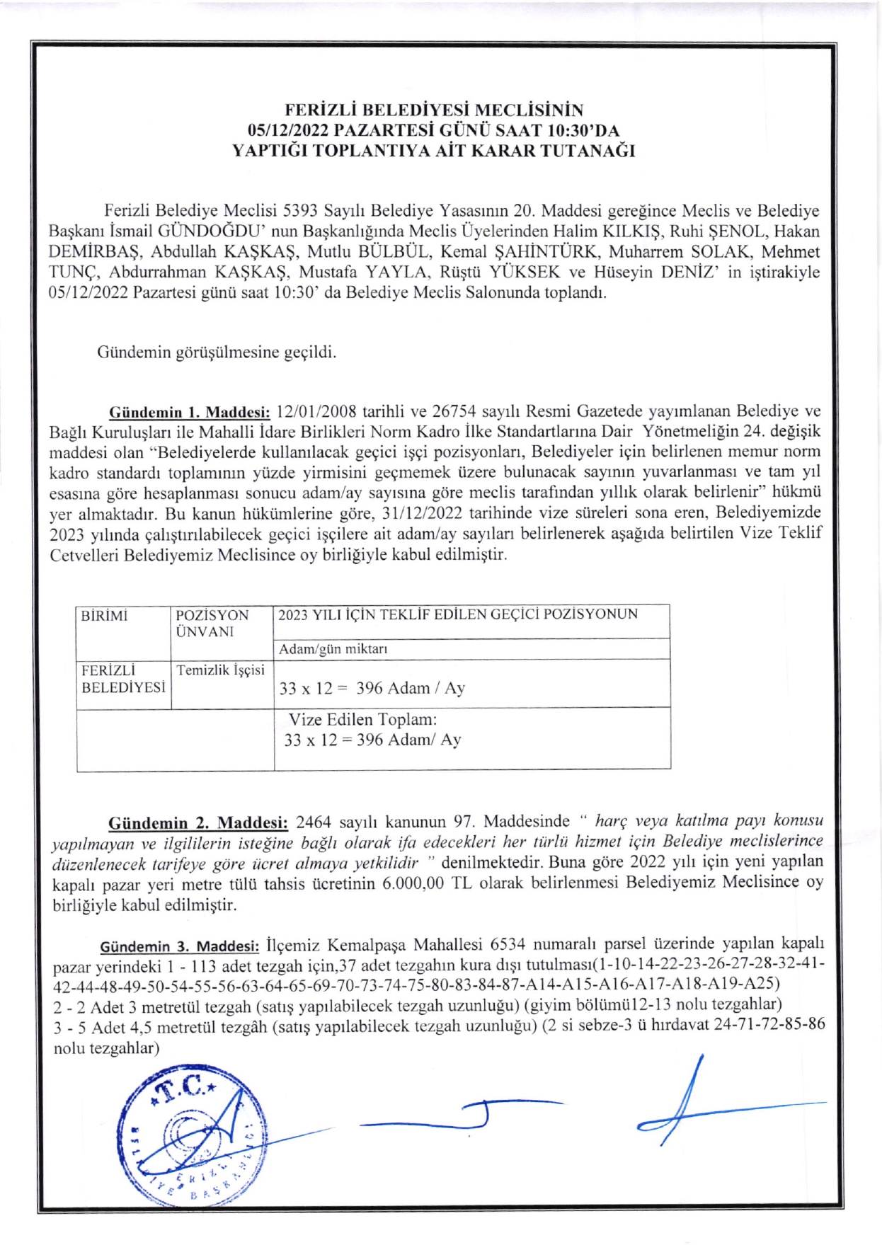 Ferizli Belediyesi Aralık Ayı Meclis Kararları (05.12.2022 Pazartesi)