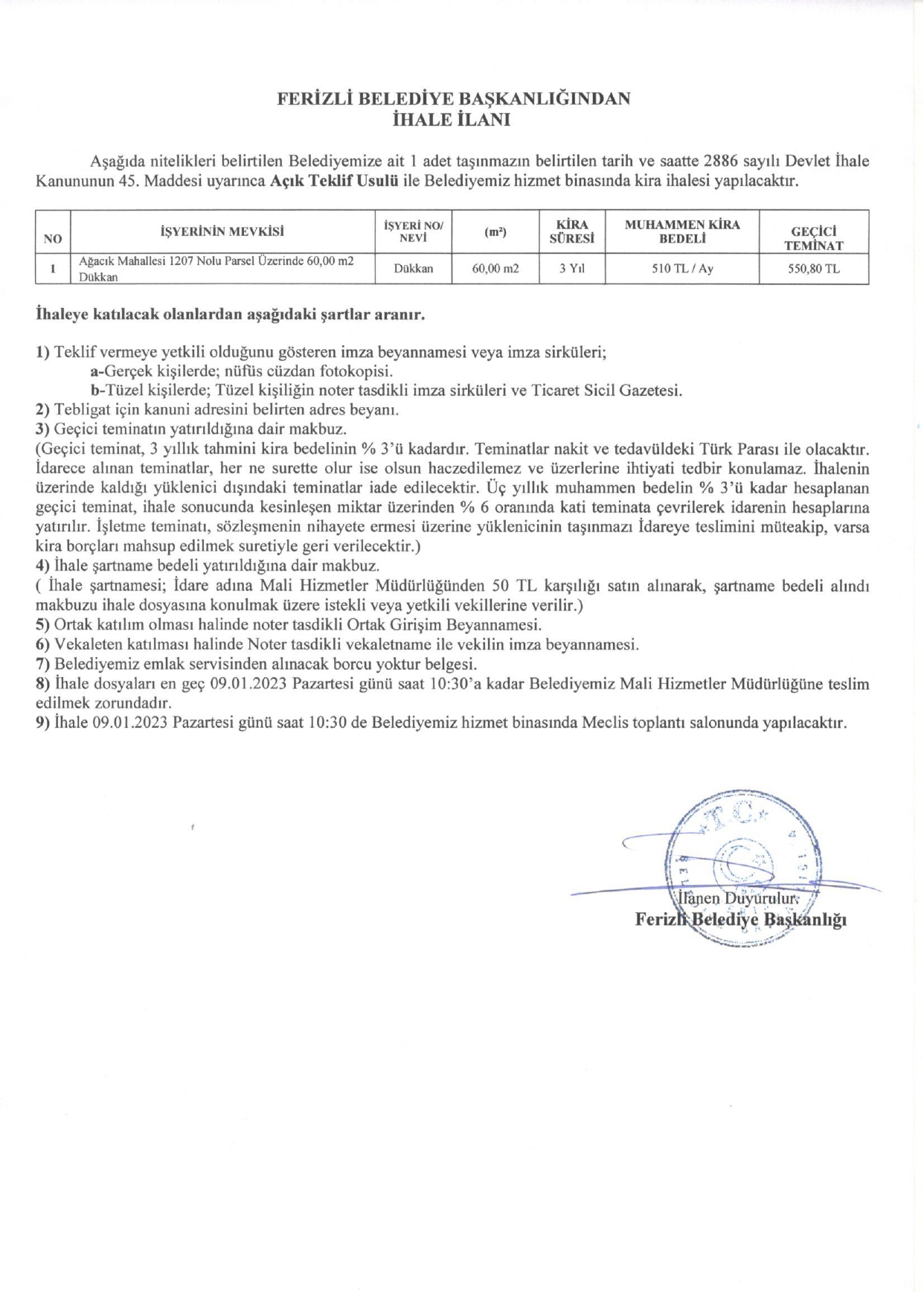 FERİZLİ BELEDİYESİ İHALE İLANI