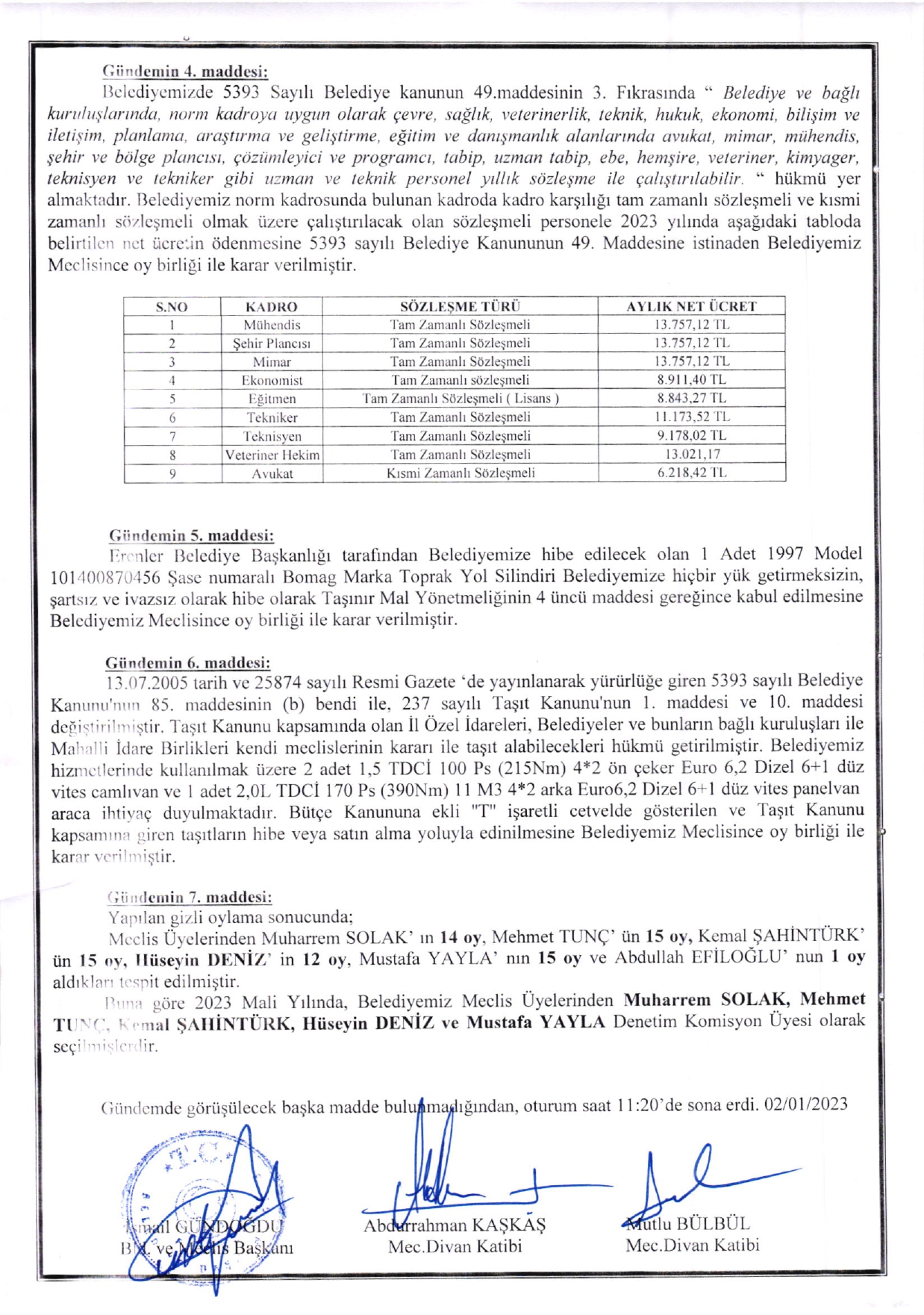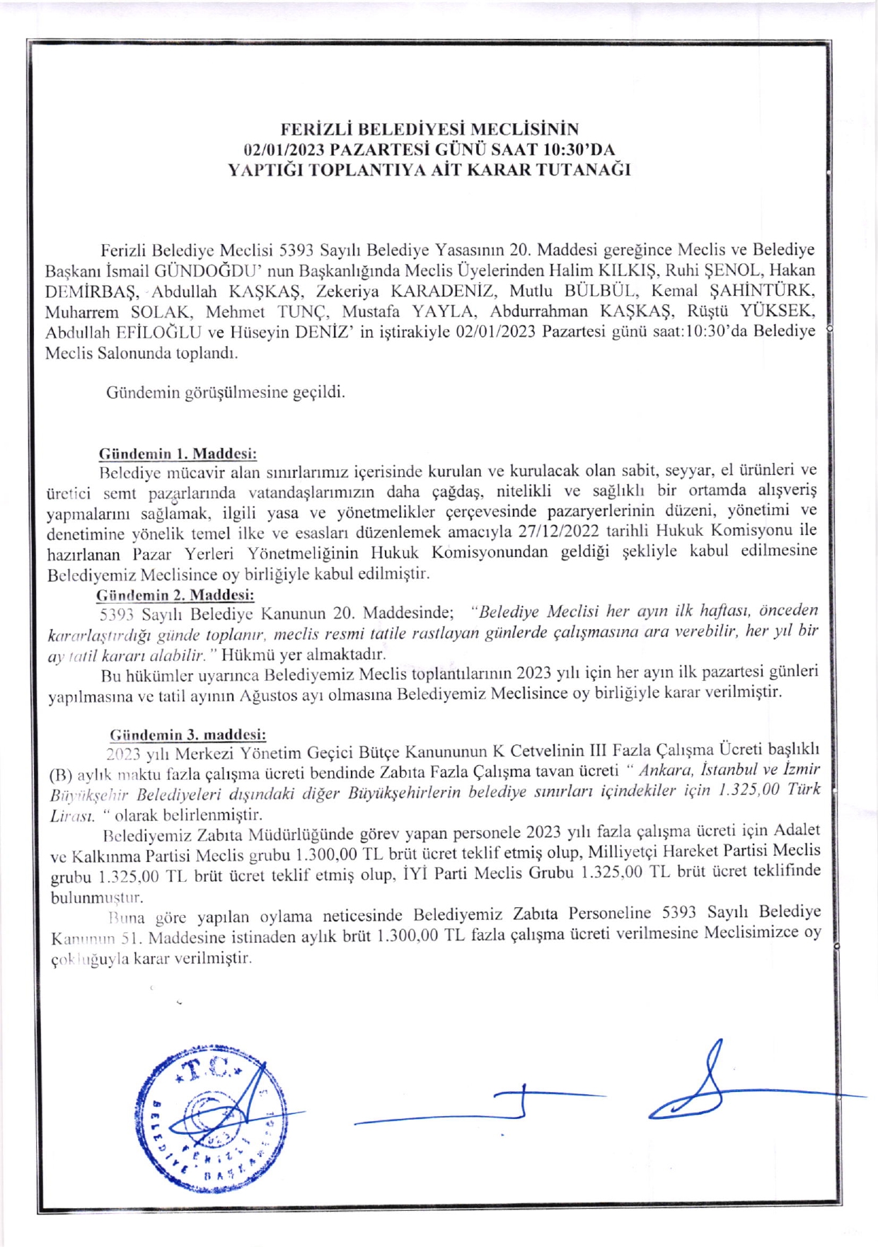 Ferizli Belediyesi Ocak Ayı Meclis Kararları (02.01.2023 Pazartesi)