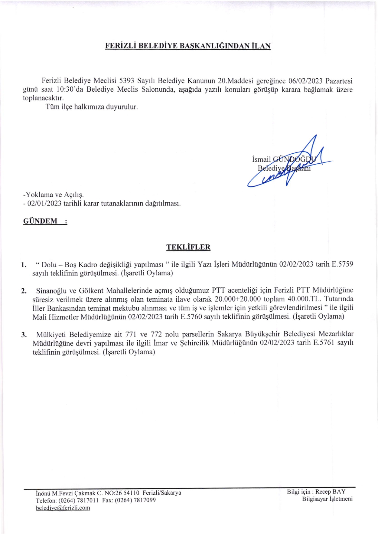 Ferizli Belediyesi Şubat Ayı Meclis Gündemi (06.02.2023 Pazartesi)