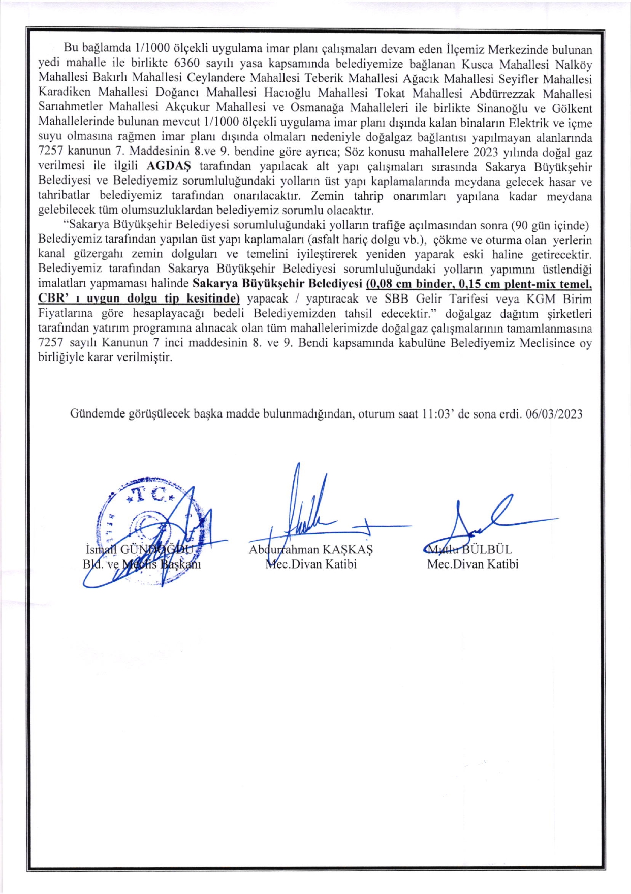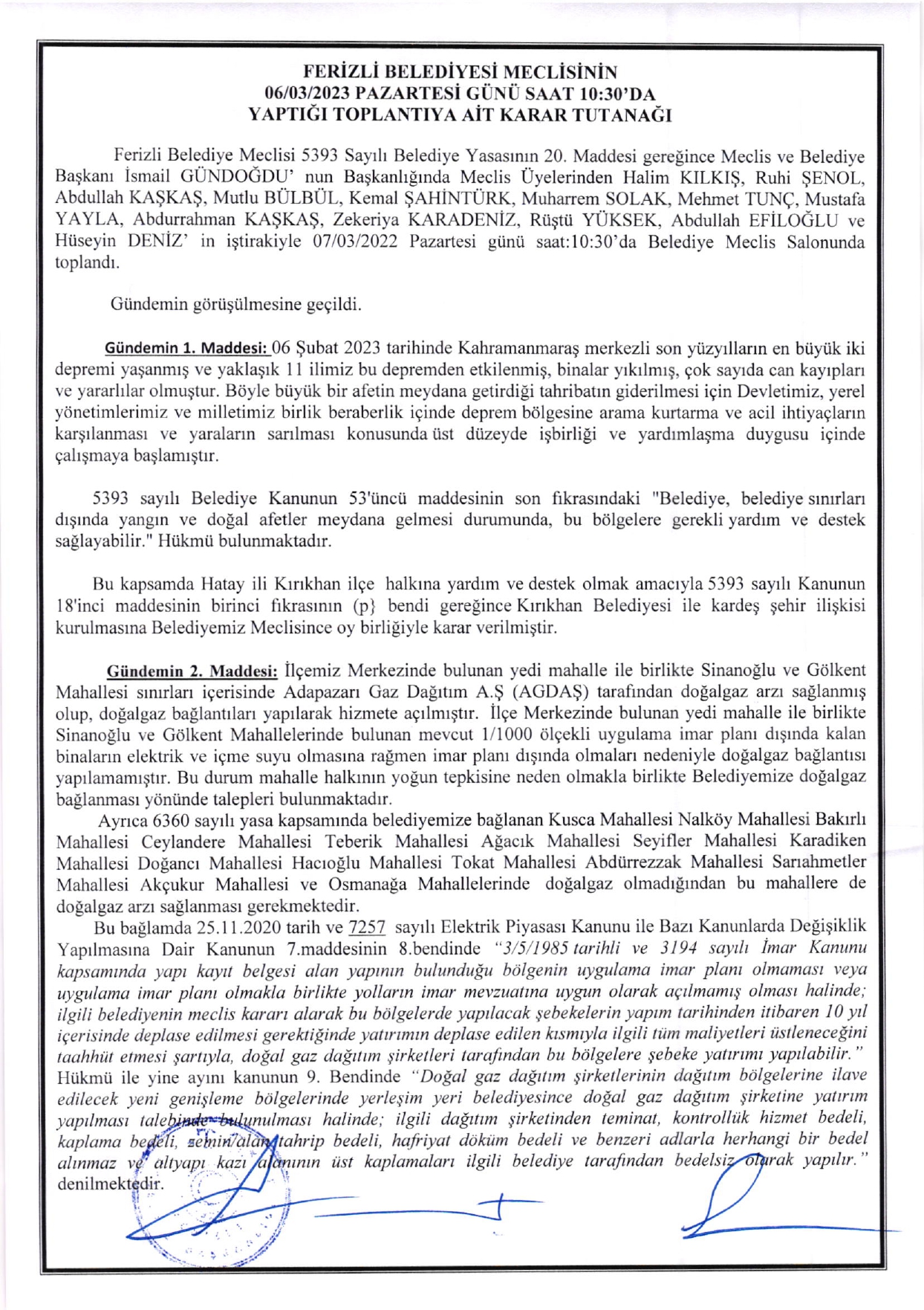 Ferizli Belediyesi Mart Ayı Meclis Kararları (06.03.2023 Pazartesi)