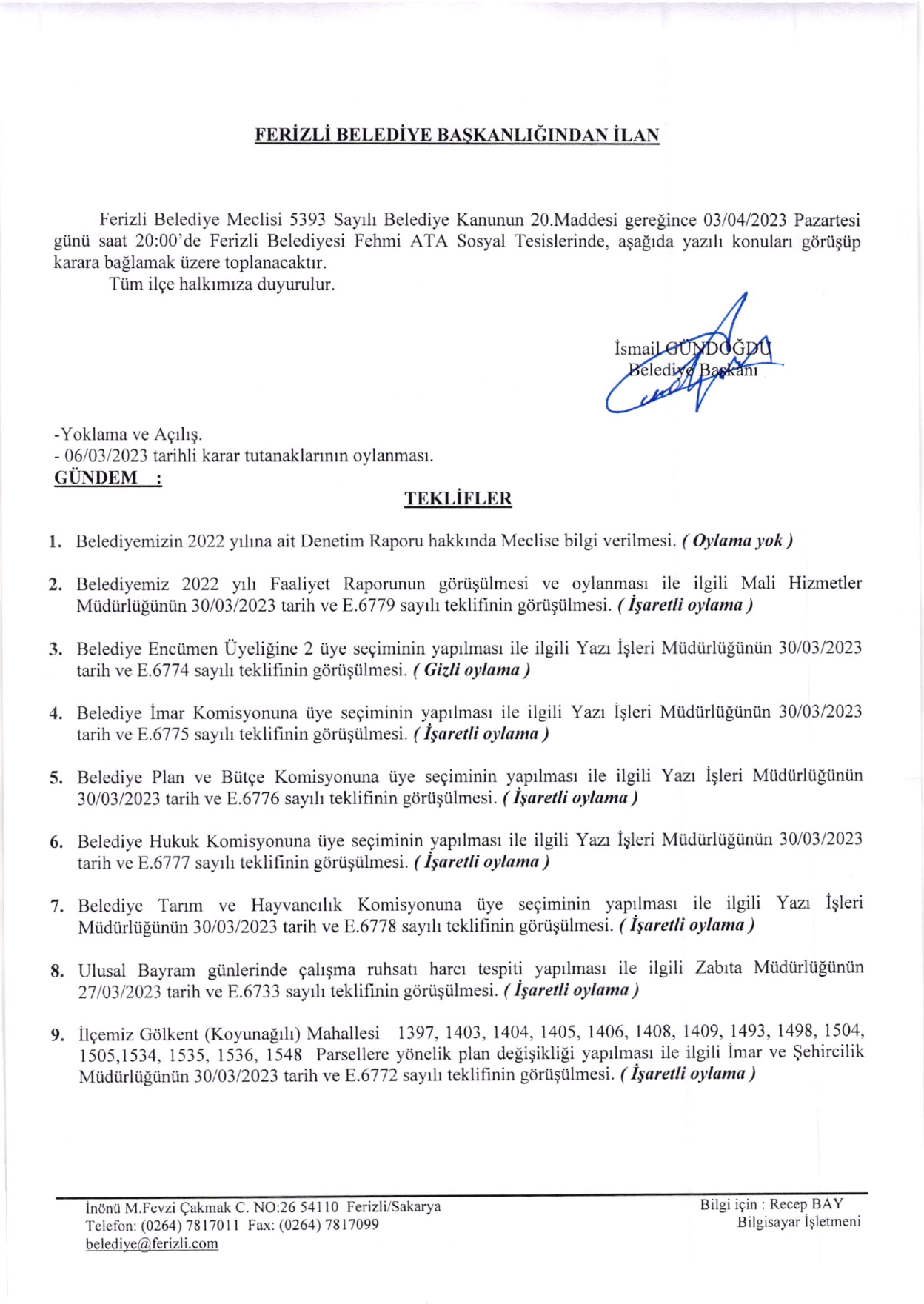 Ferizli Belediyesi Nisan Ayı Meclis Gündemi (03.04.2023 Pazartesi)