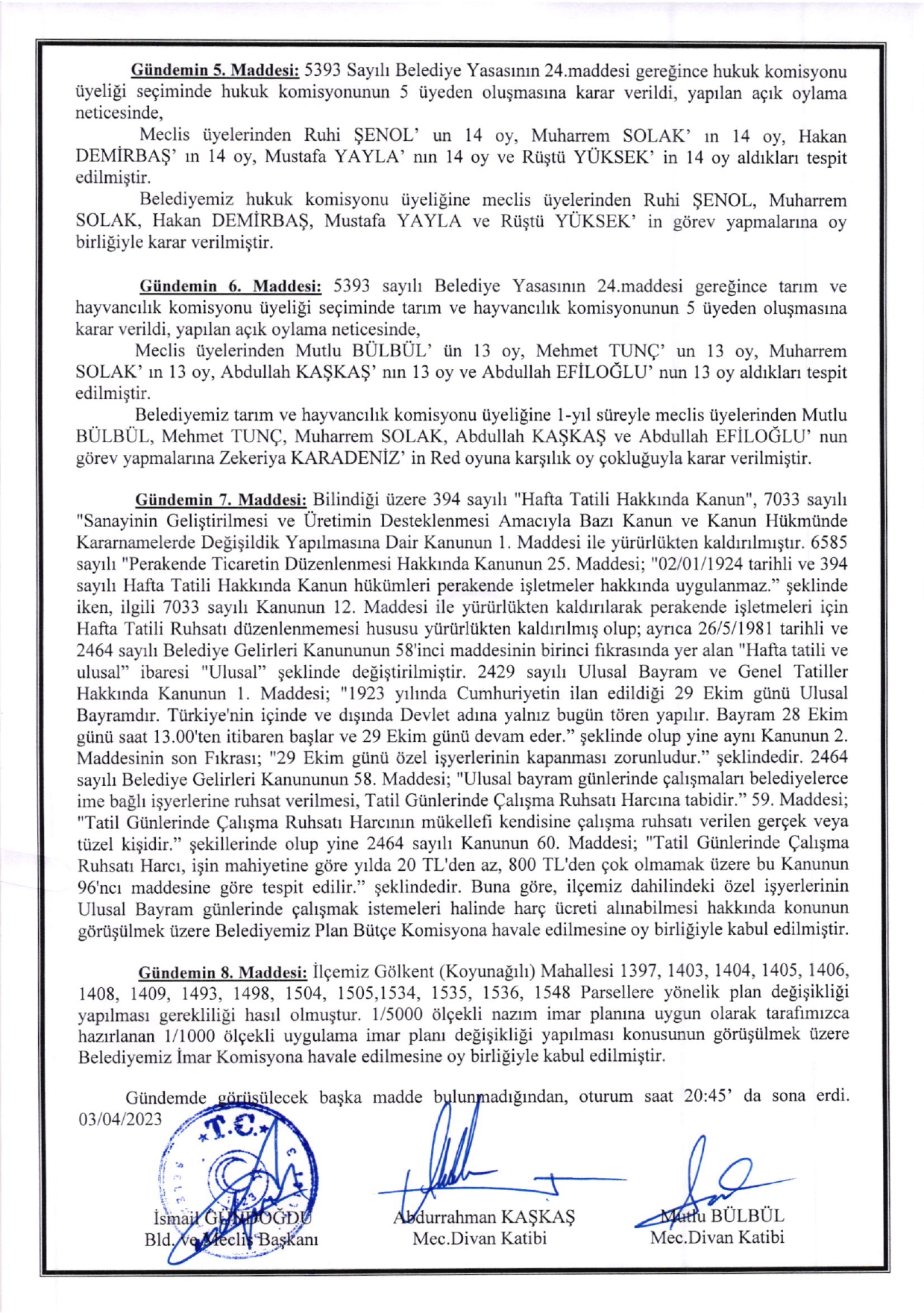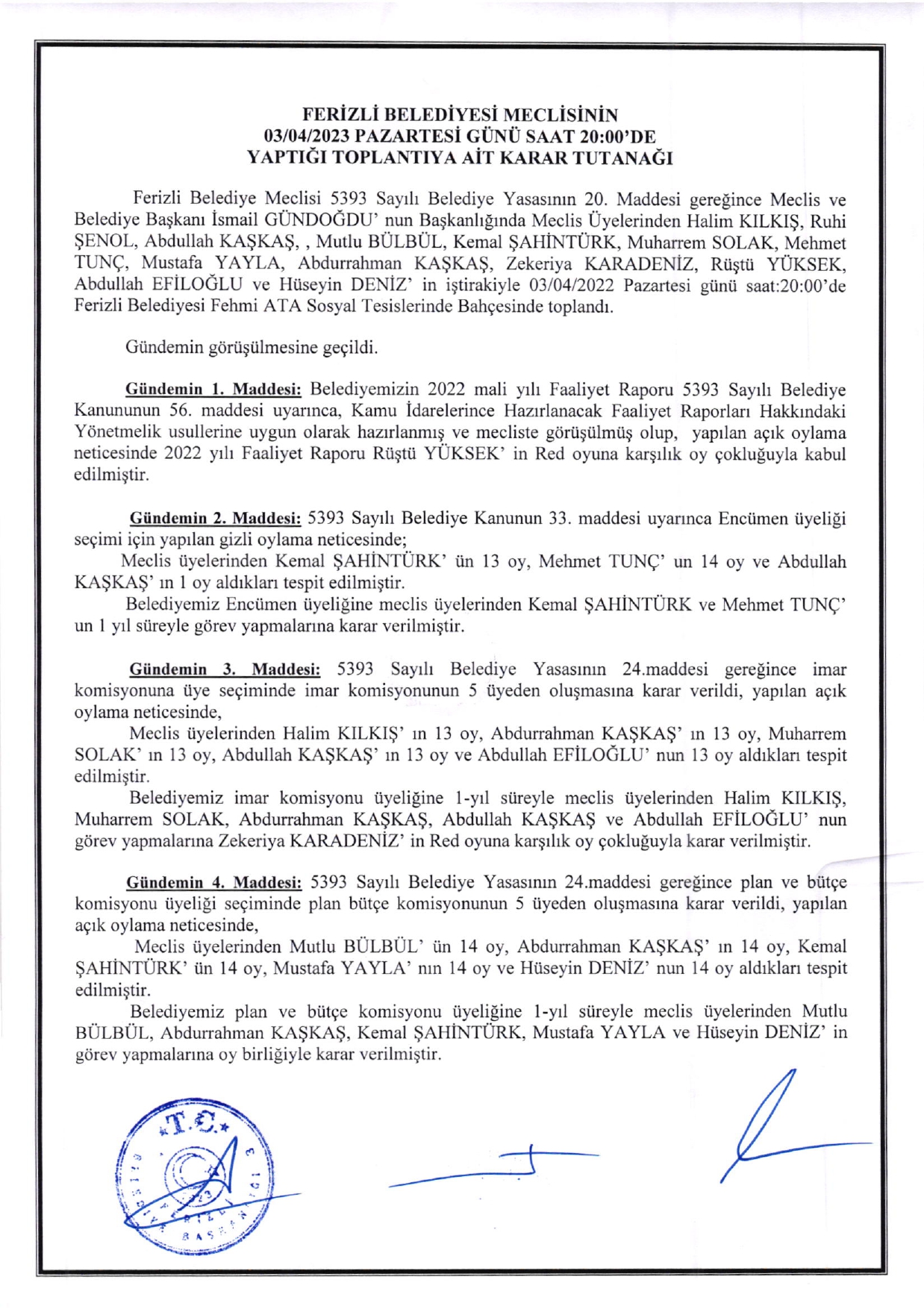 Ferizli Belediyesi Nisan Ayı Meclis Kararları (03.04.2023 Pazartesi)