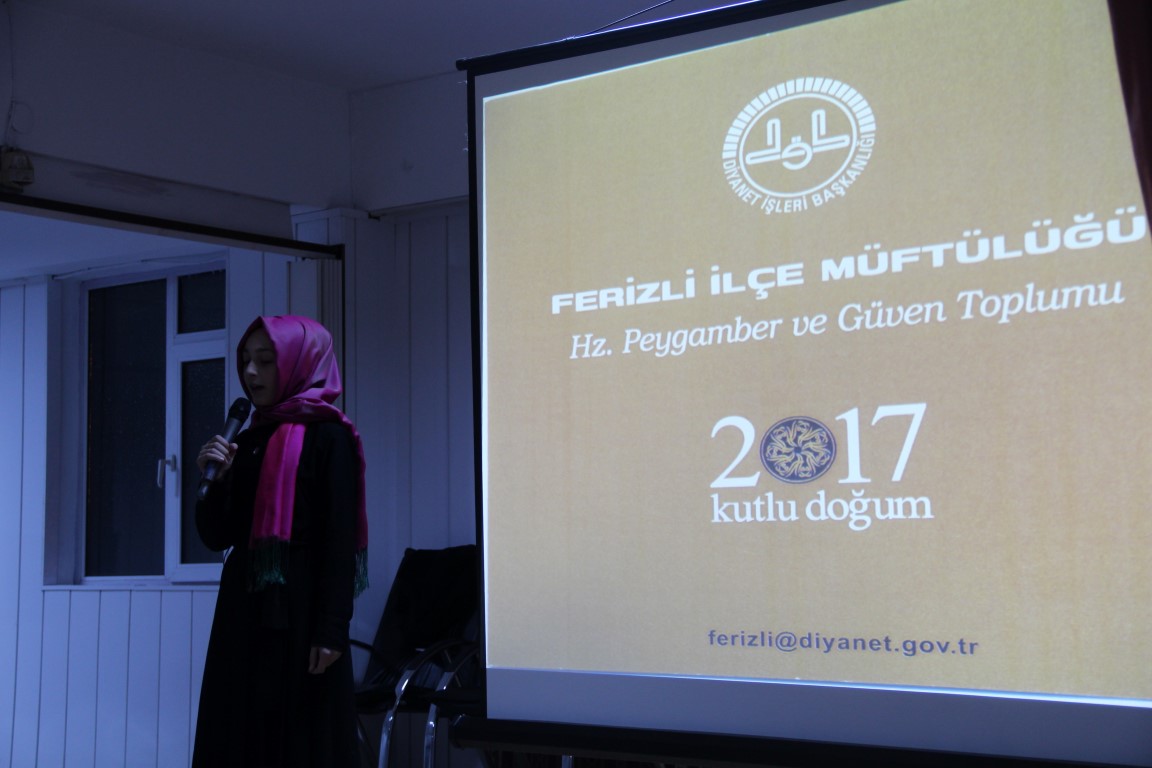 Şiir dinletisi ve sinevizyon gösterimiyle devam eden Kutlu Doğum Haftası programında Ferizli ilçe müftülüğü konferans salonunu dolduran katılımcılara hitaben İlahiyatçı yazar Ragıp Güzel ‘’Hz. Peygamber ve Güven Toplumu’’ konulu konuşmasını yaptı. Güzel, ‘’Peygamberimiz Hz. Muhammed’in (SAV) her söylediğinde ayrı bir özellik vardır. Peygamberimizin (SAV) örnek hayatından ilham almalıyız. Komşularımızla, eşlerimizle iyi geçinmeliyiz. Müslüman elinden ve dilinden kimsenin zarar görmeyeceği insandır. Emanete riayet etmeyenin, sözüne sadık olmayanın imanı eksiktir. Peygamber efendimizin (SAV) duasını almak istiyorsak, kimsenin gıybetini etmemeliyiz. Çevresiyle ve eşleriyle iyi geçinen, ahlaklı kişiler Efendimizin (SAV) buyurduğu gibi; sizin en hayırlılarınızdır, ‘’dedi.