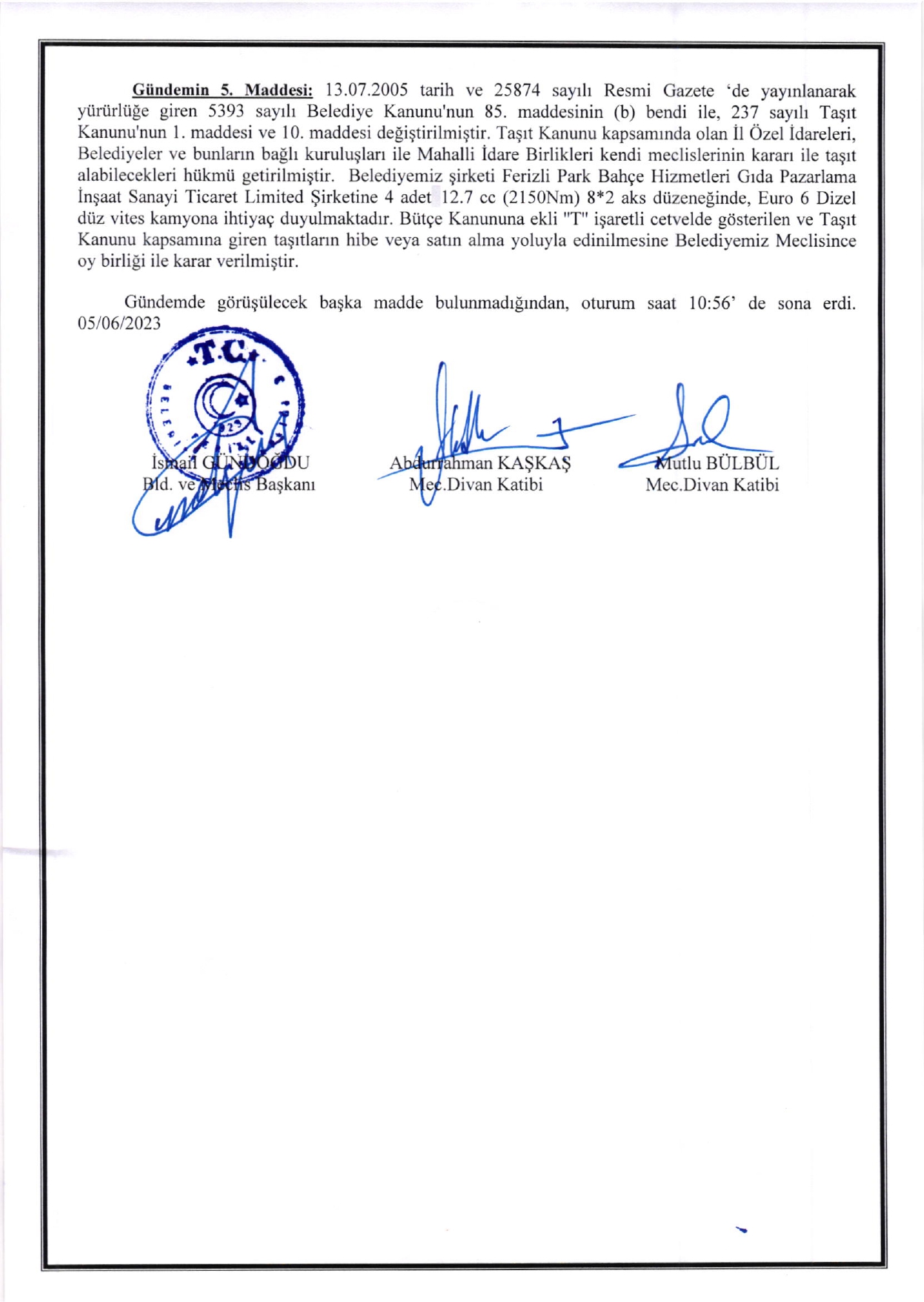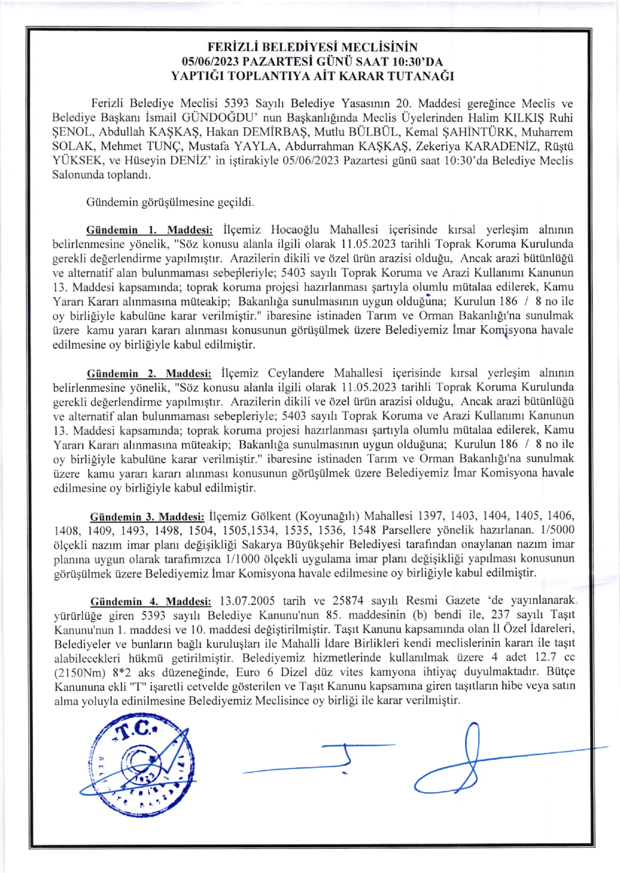 Ferizli Belediyesi Haziran Ayı Meclis Kararları (05.06.2023 Pazartesi)