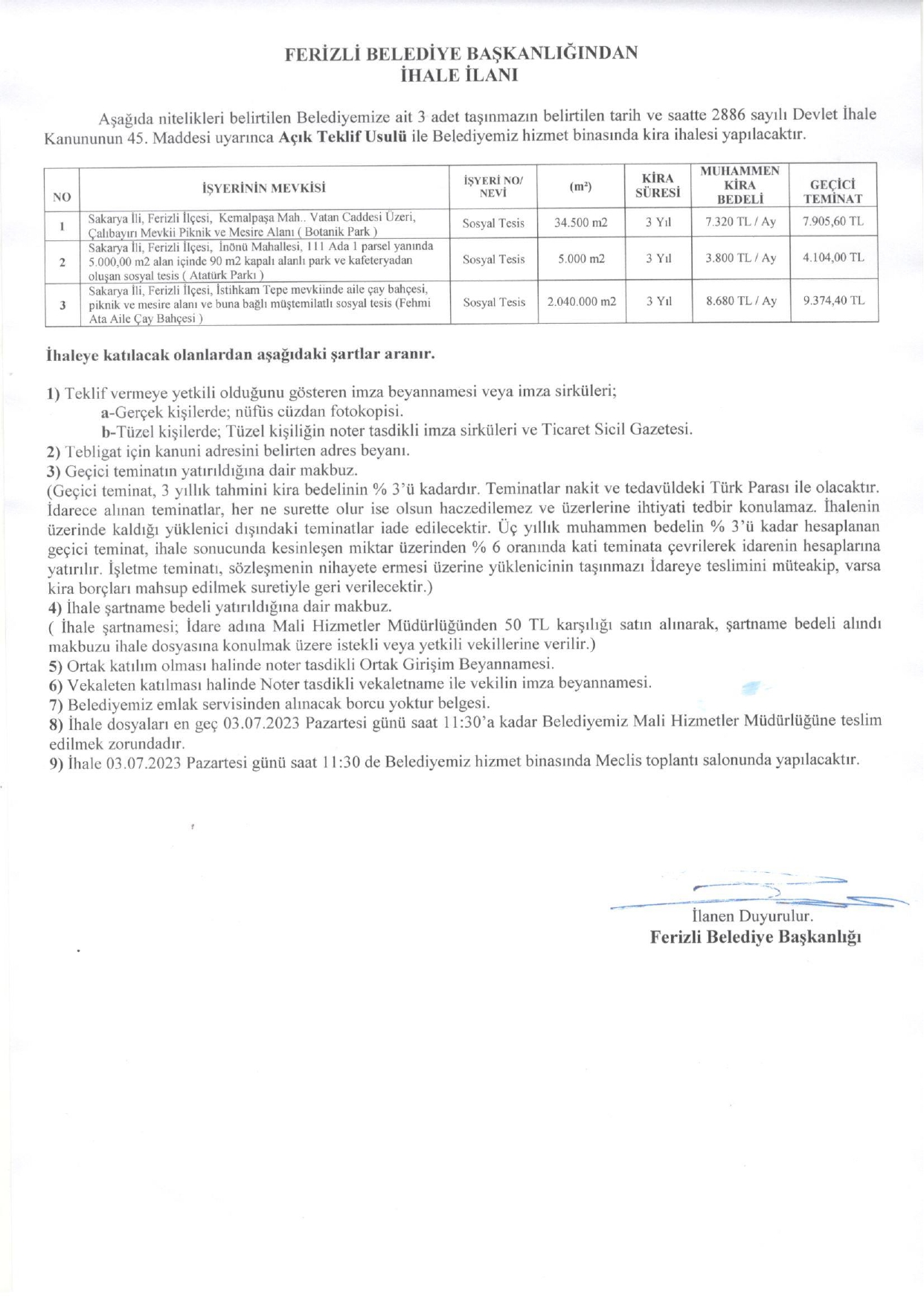 FERİZLİ BELEDİYESİ İHALE İLANI