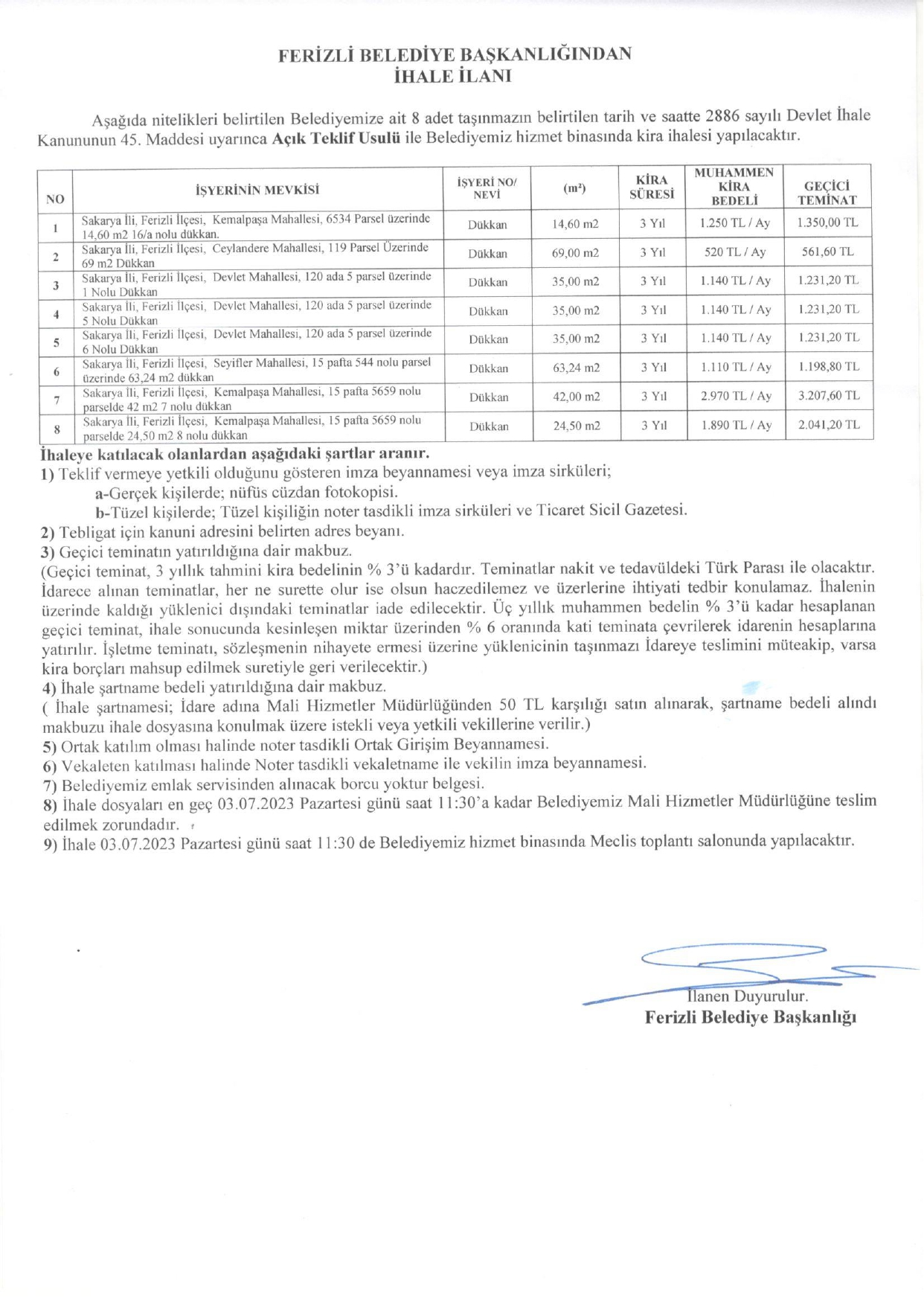 FERİZLİ BELEDİYESİ İHALE İLANI