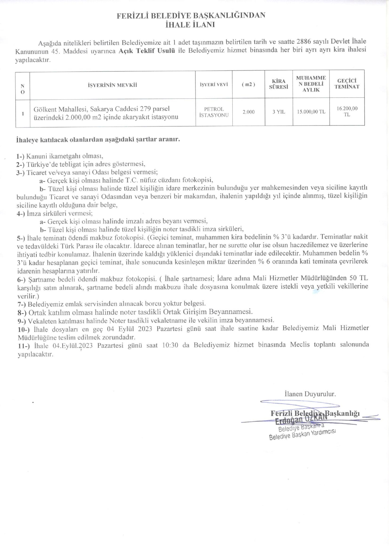 FERİZLİ BELEDİYESİ İHALE İLANI