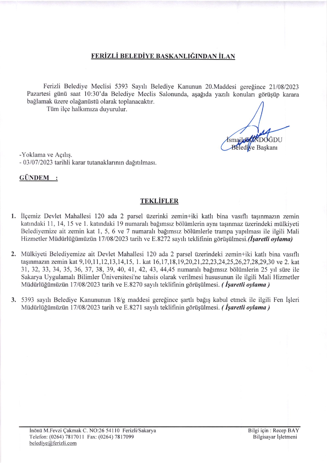 Ferizli Belediyesi Olağanüstü Meclis Gündemi (21.08.2023 Pazartesi)