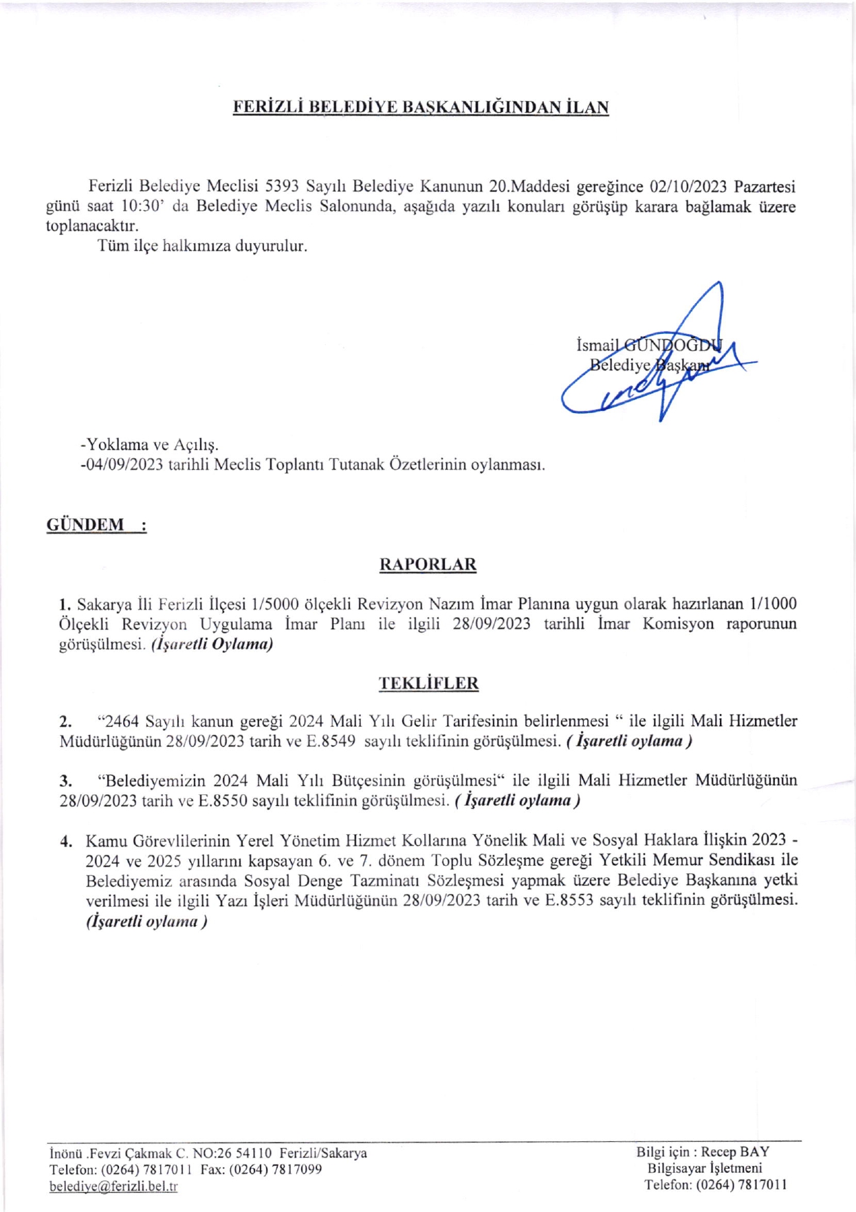 Ferizli Belediyesi Ekim Ayı Meclis Gündemi (02.10.2023 Pazartesi)