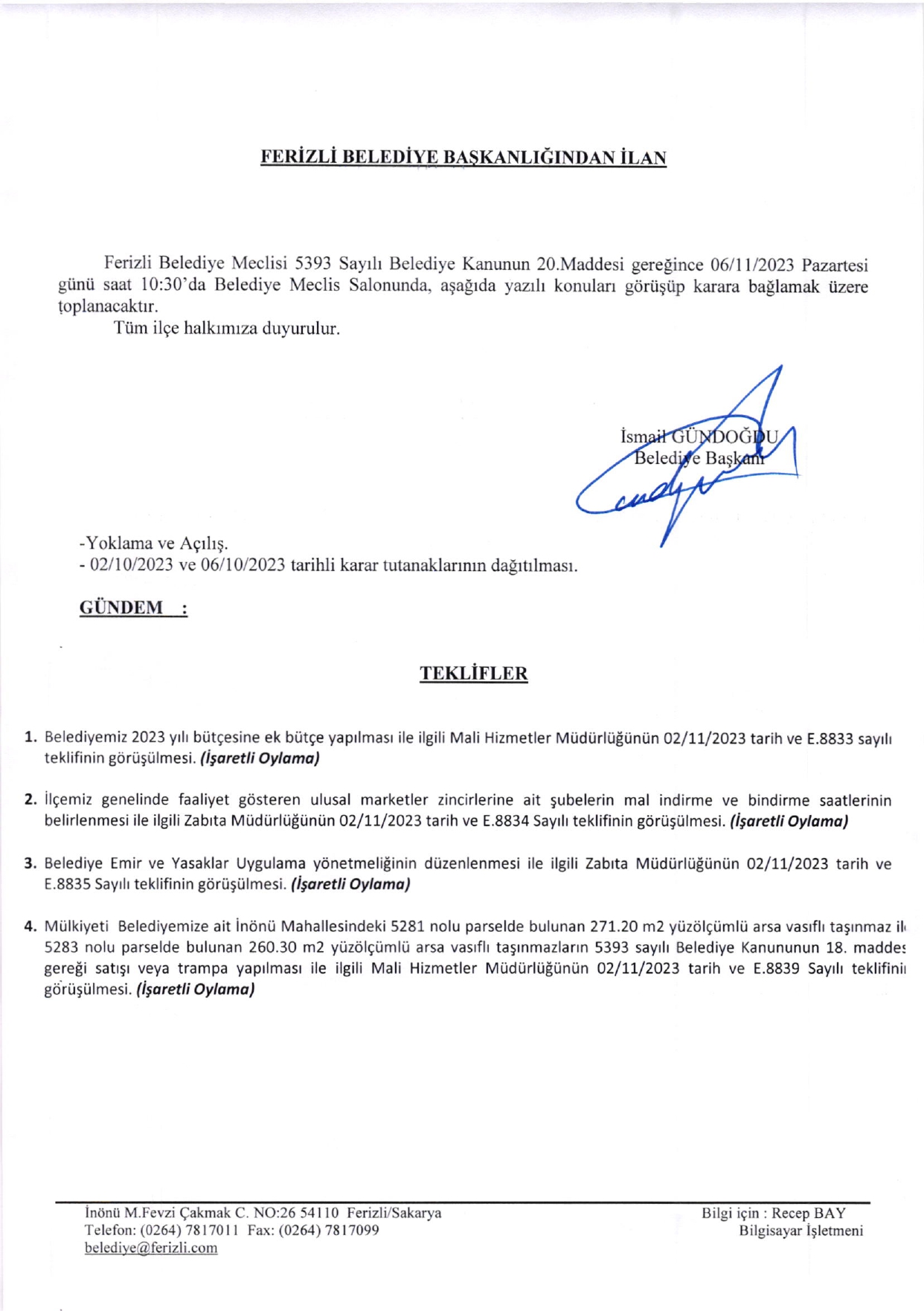 Ferizli Belediyesi Kasım Ayı Meclis Gündemi (06.11.2023 Pazartesi)