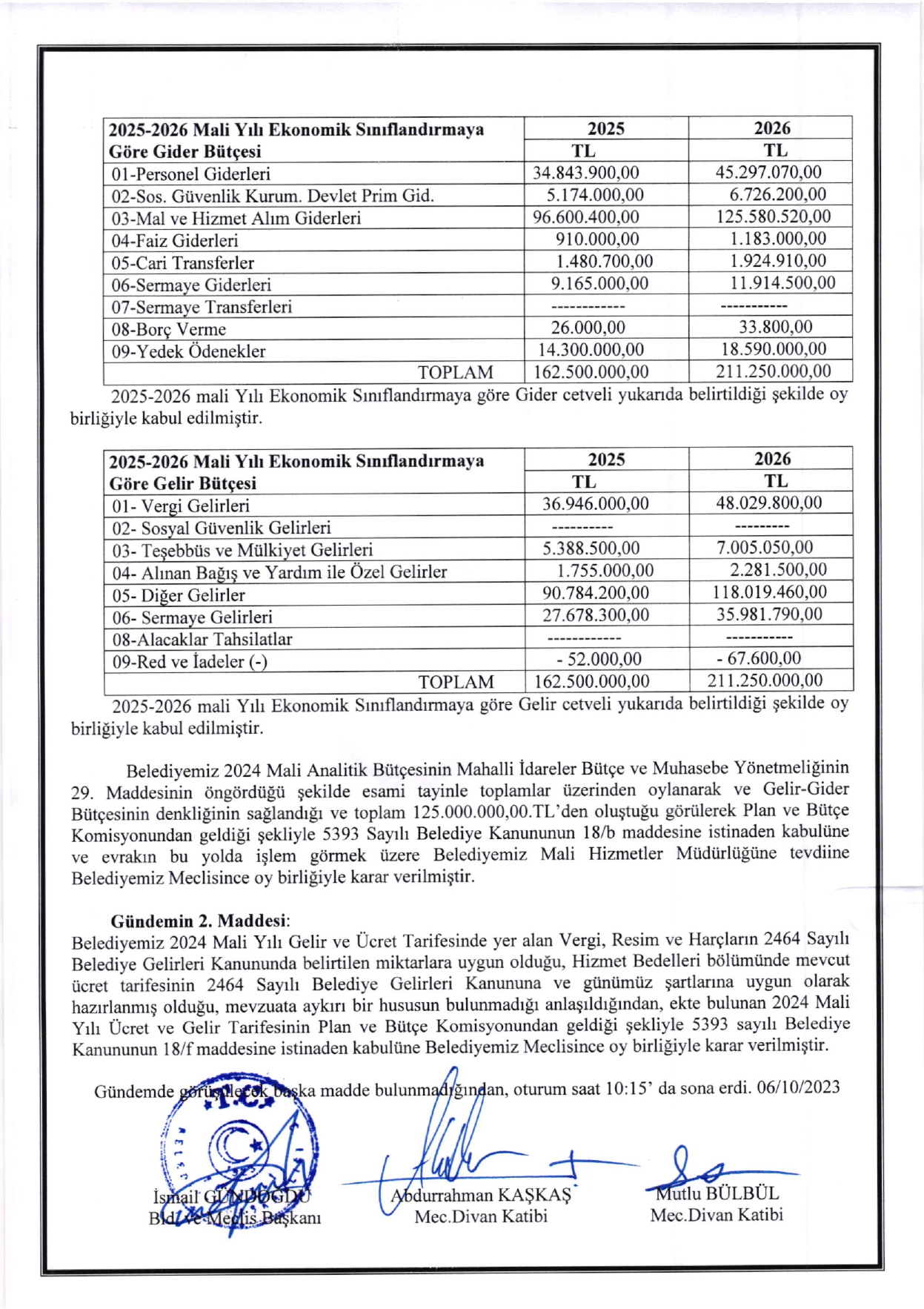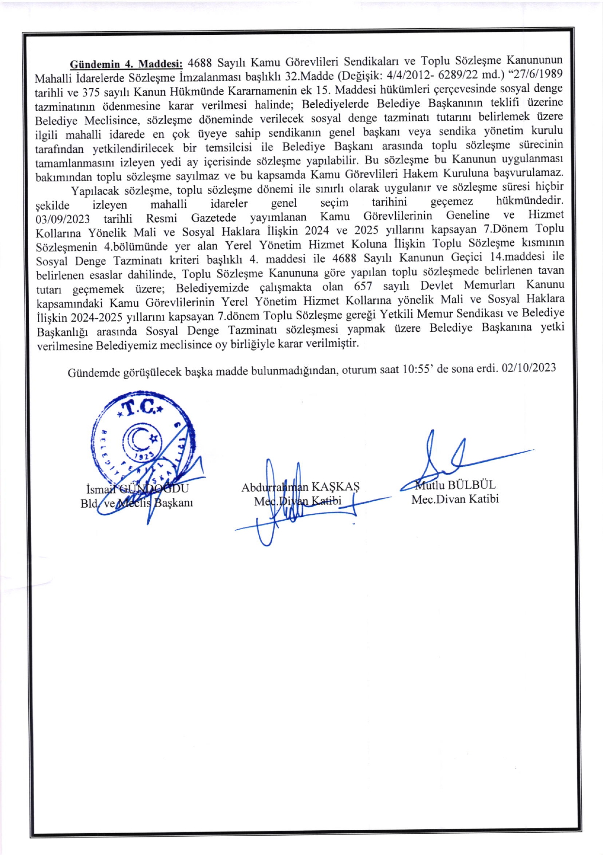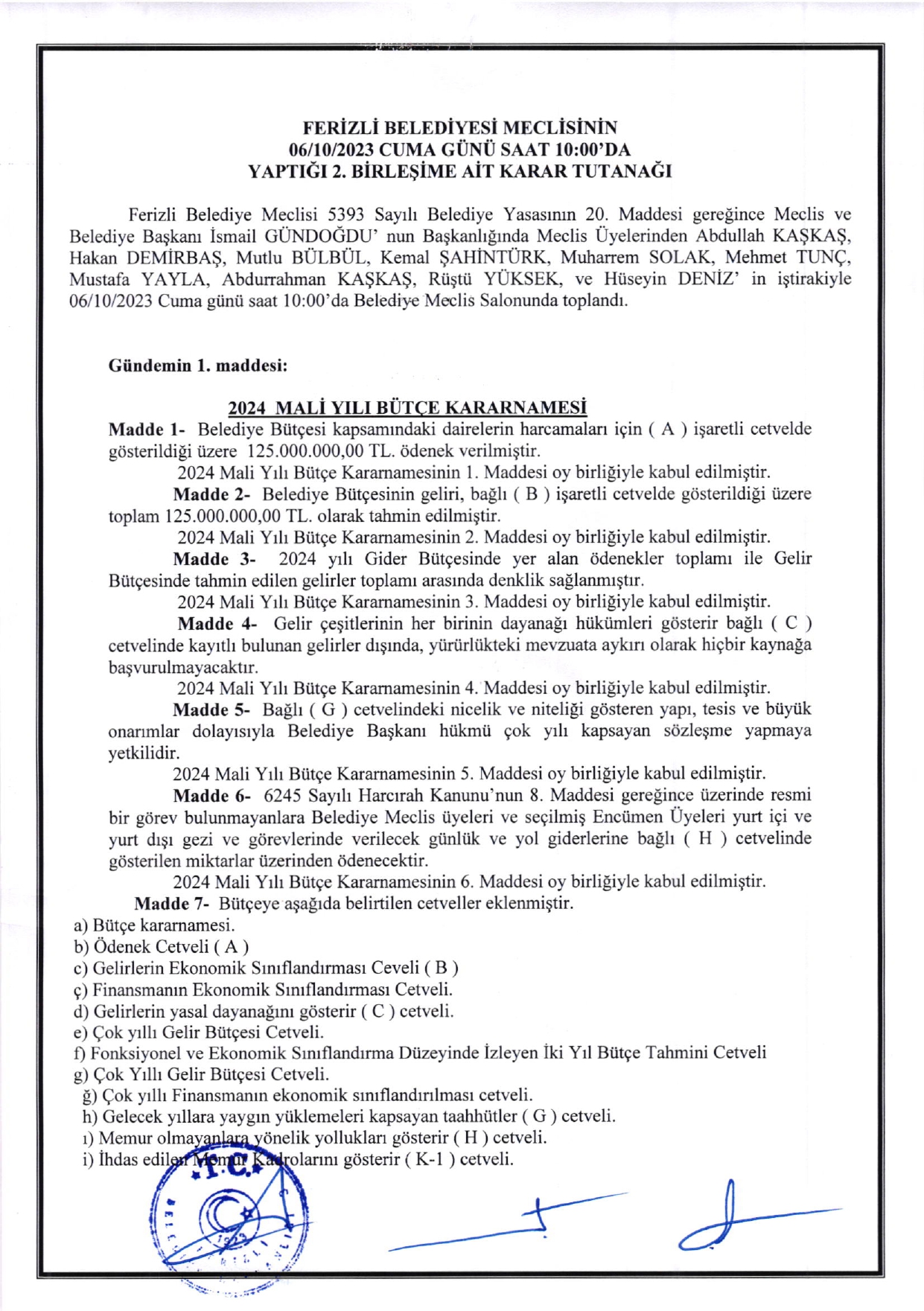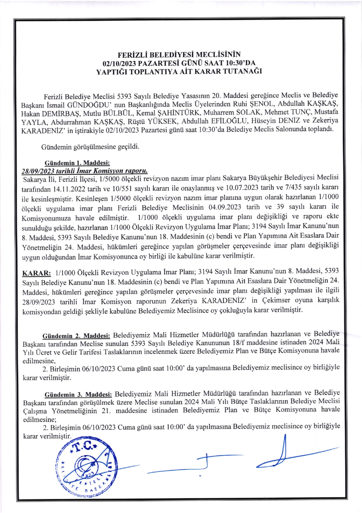 Ferizli Belediyesi Ekim Ayı Meclis Kararları (02.10.2023 Pazartesi)