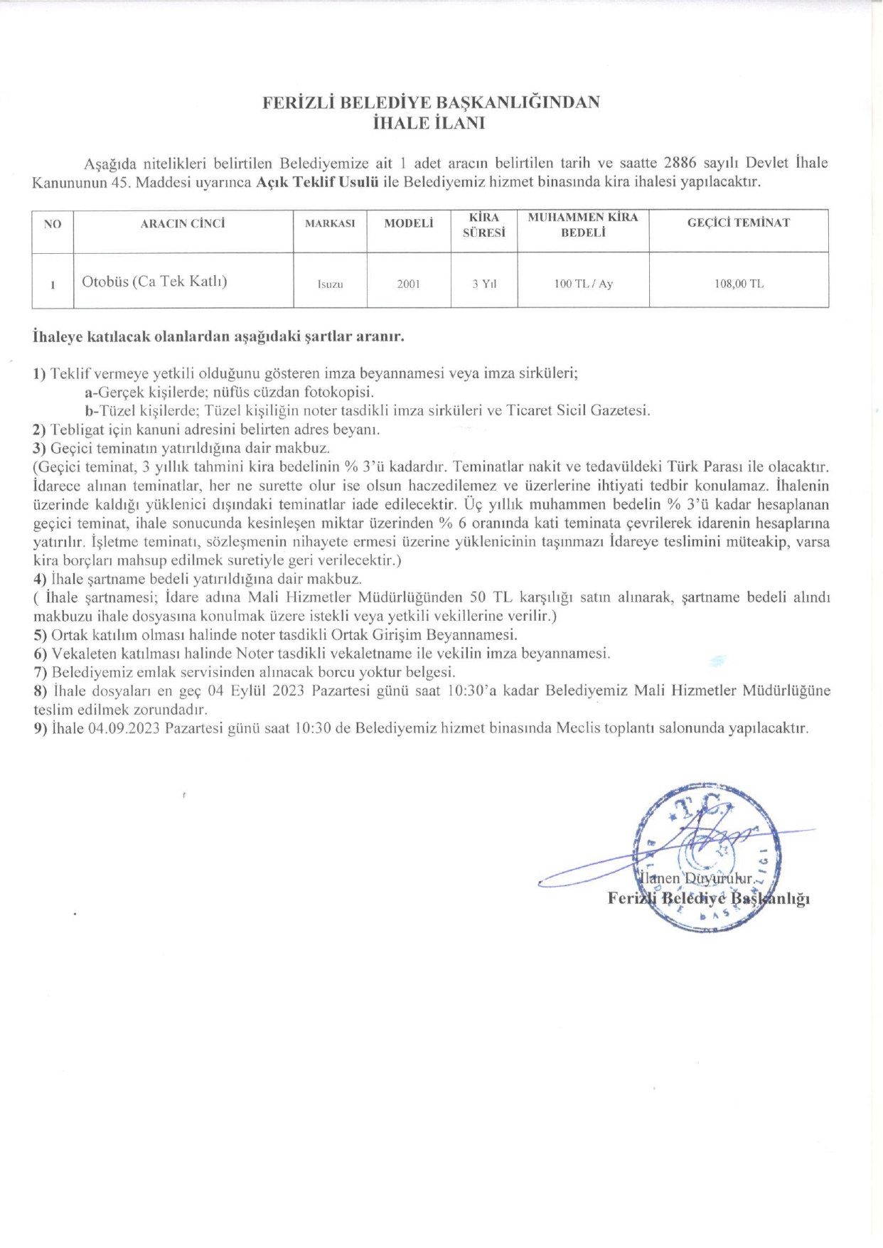 FERİZLİ BELEDİYESİ İHALE İLANI