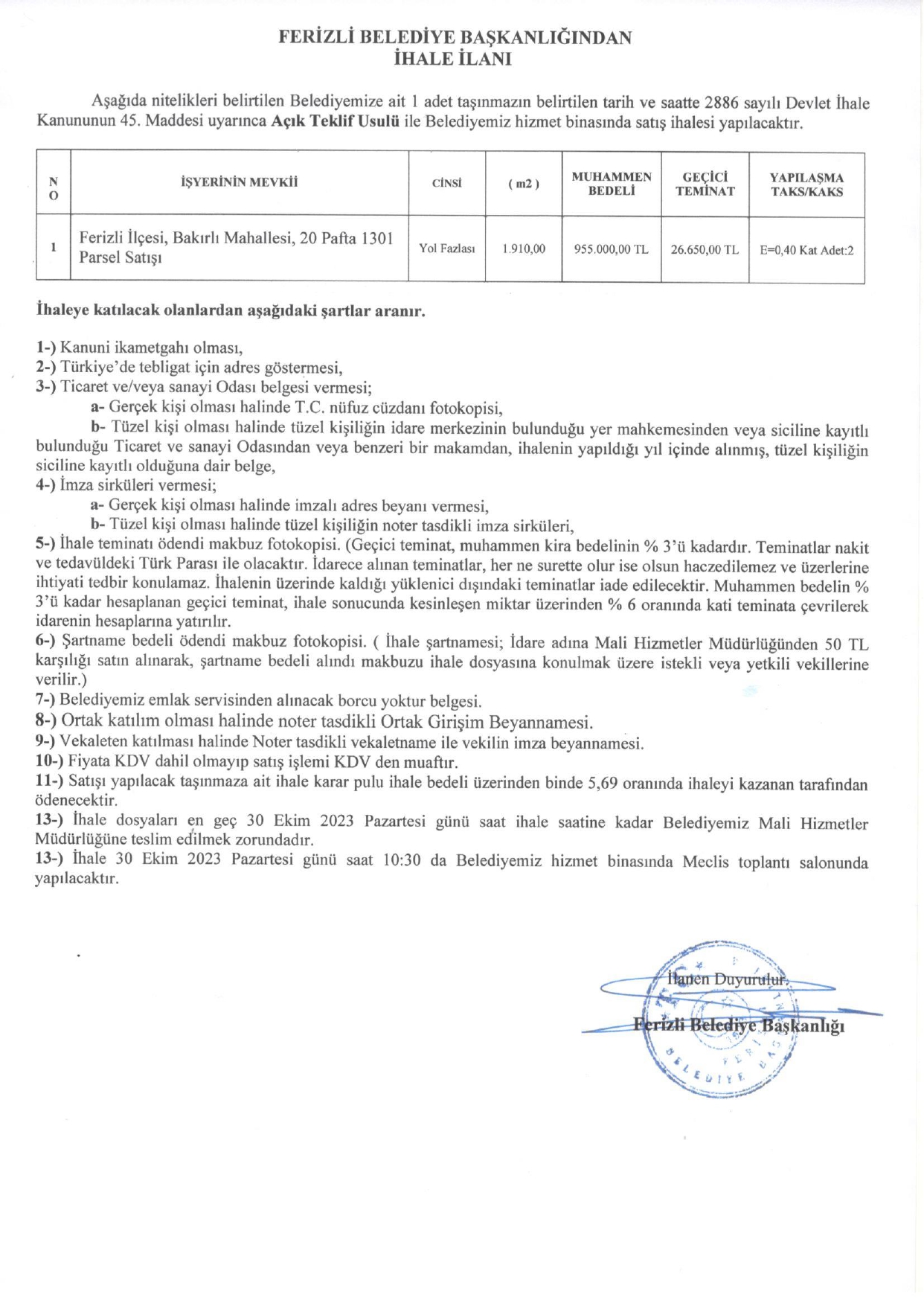 FERİZLİ BELEDİYESİ İHALE İLANI
