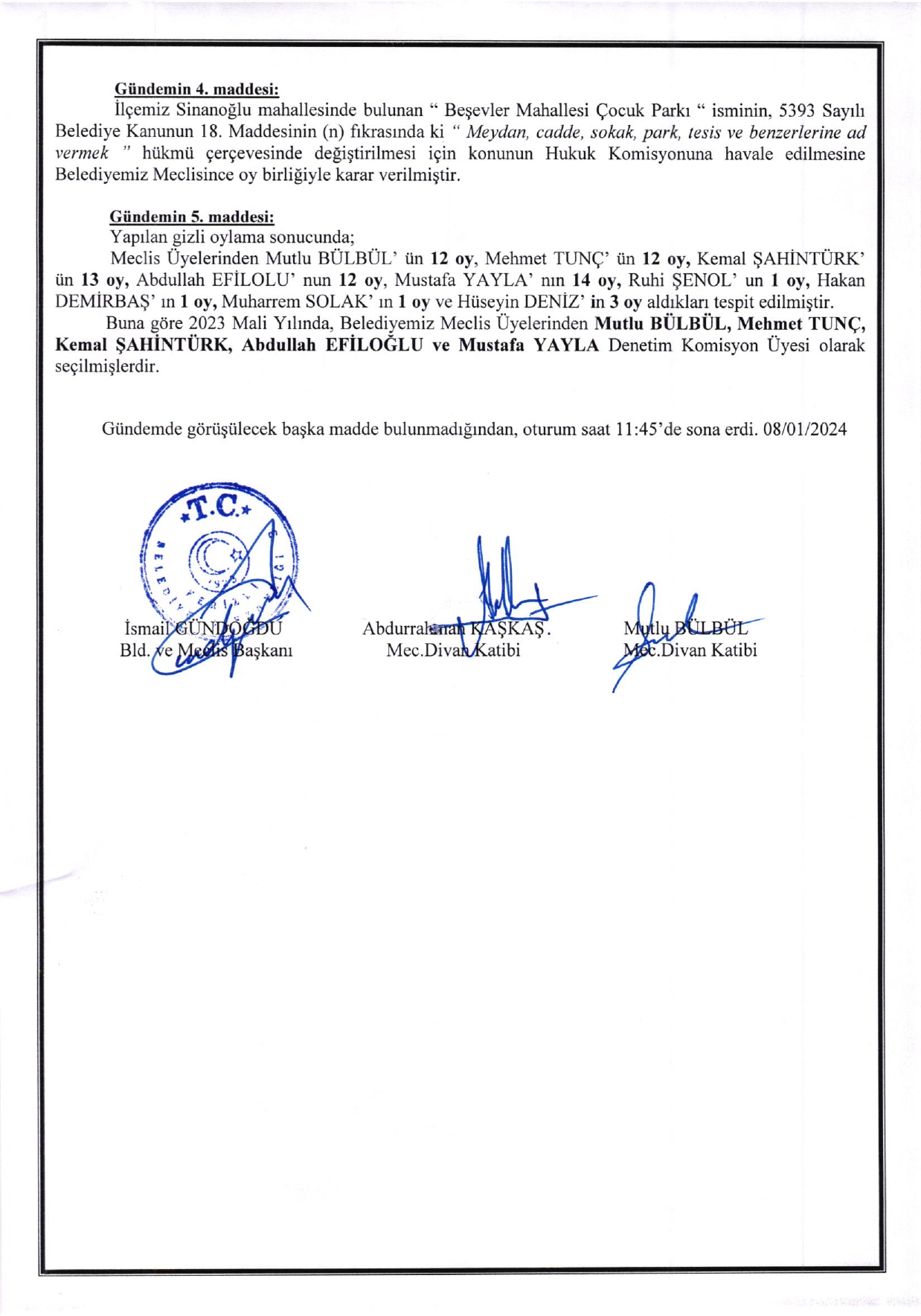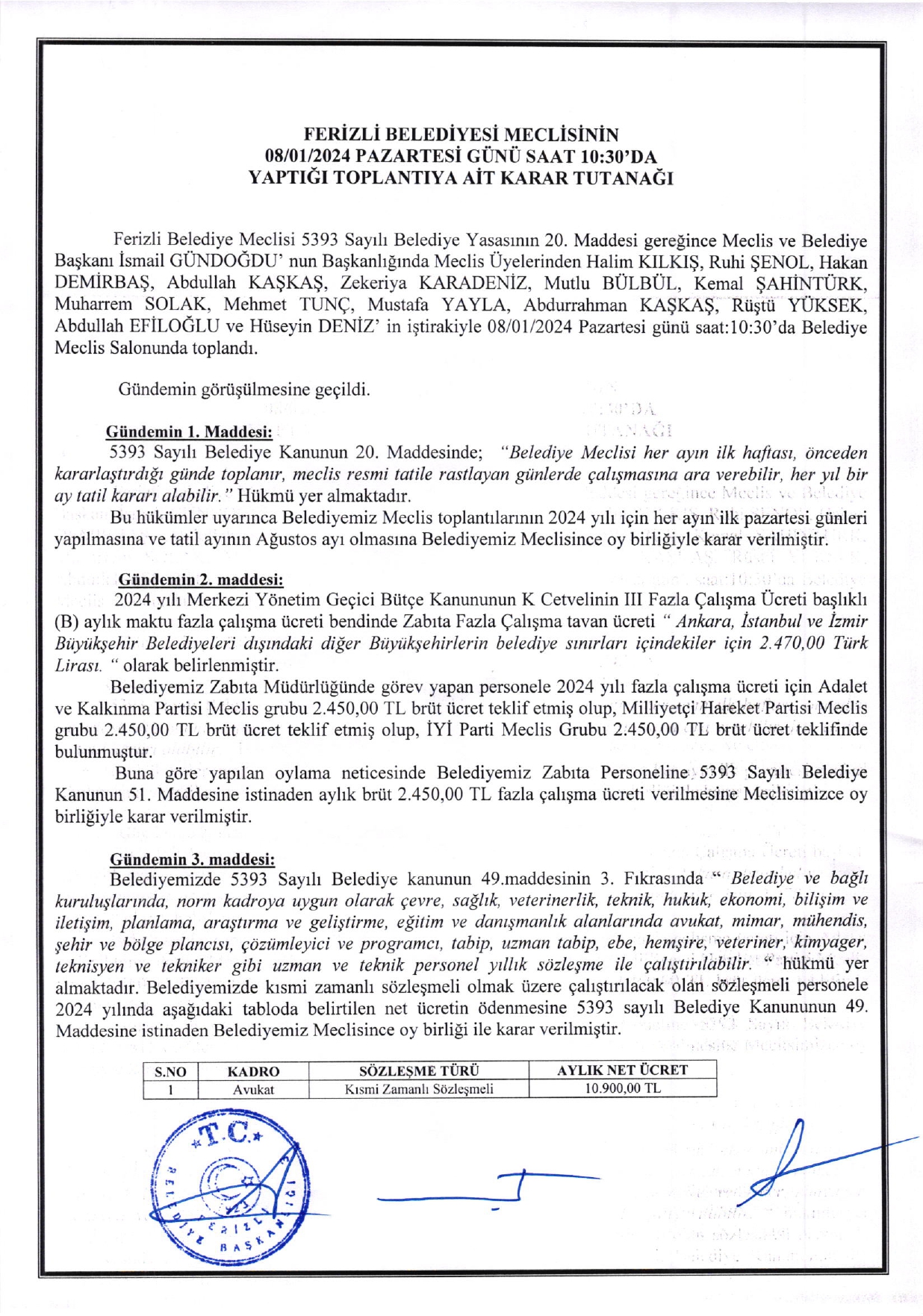 Ferizli Belediyesi Ocak Ayı Meclis Kararları (08.01.2024 Pazartesi)