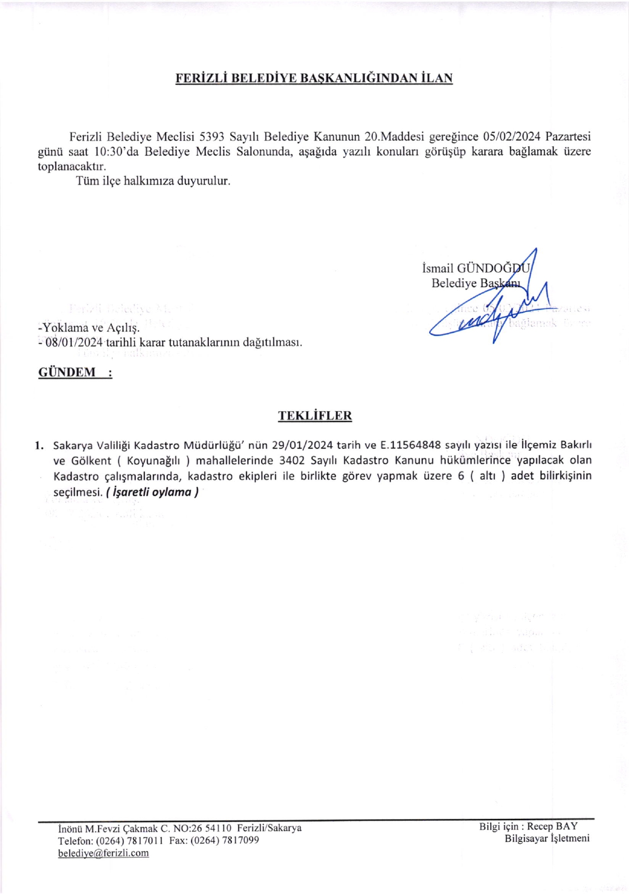 Ferizli Belediyesi Şubat Ayı Meclis Gündemi (05.02.2024 Pazartesi)