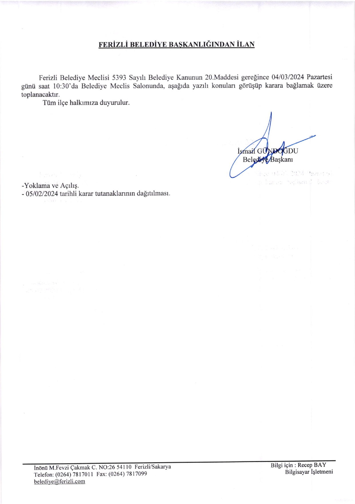 Ferizli Belediyesi Mart Ayı Meclis Gündemi (03.03.2024 Pazartesi)