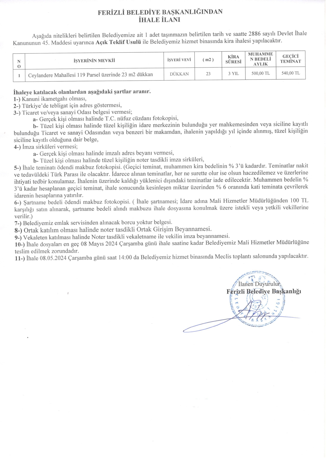 FERİZLİ BELEDİYESİ İHALE İLANI