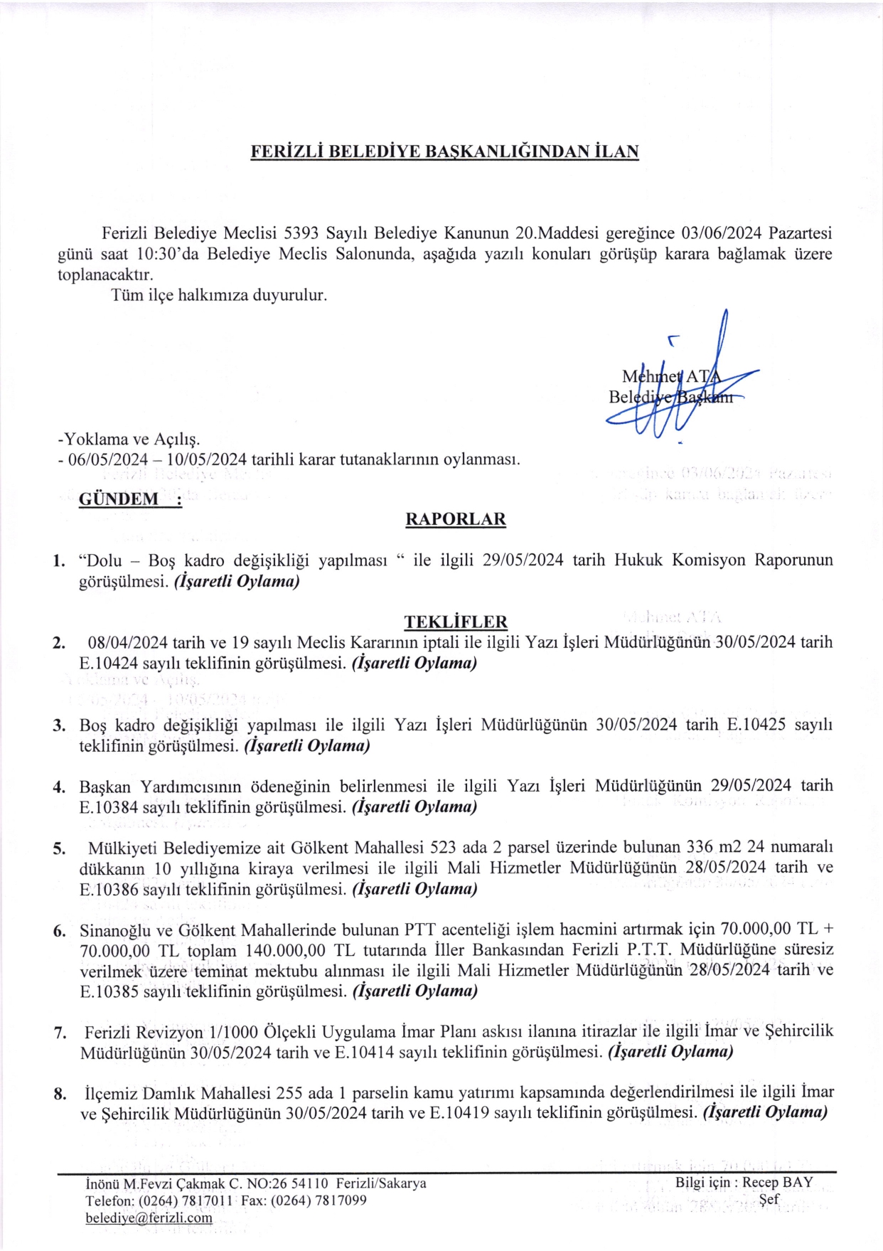 Ferizli Belediyesi Haziran Ayı Meclis Gündemi (03.06.2024 Pazartesi)