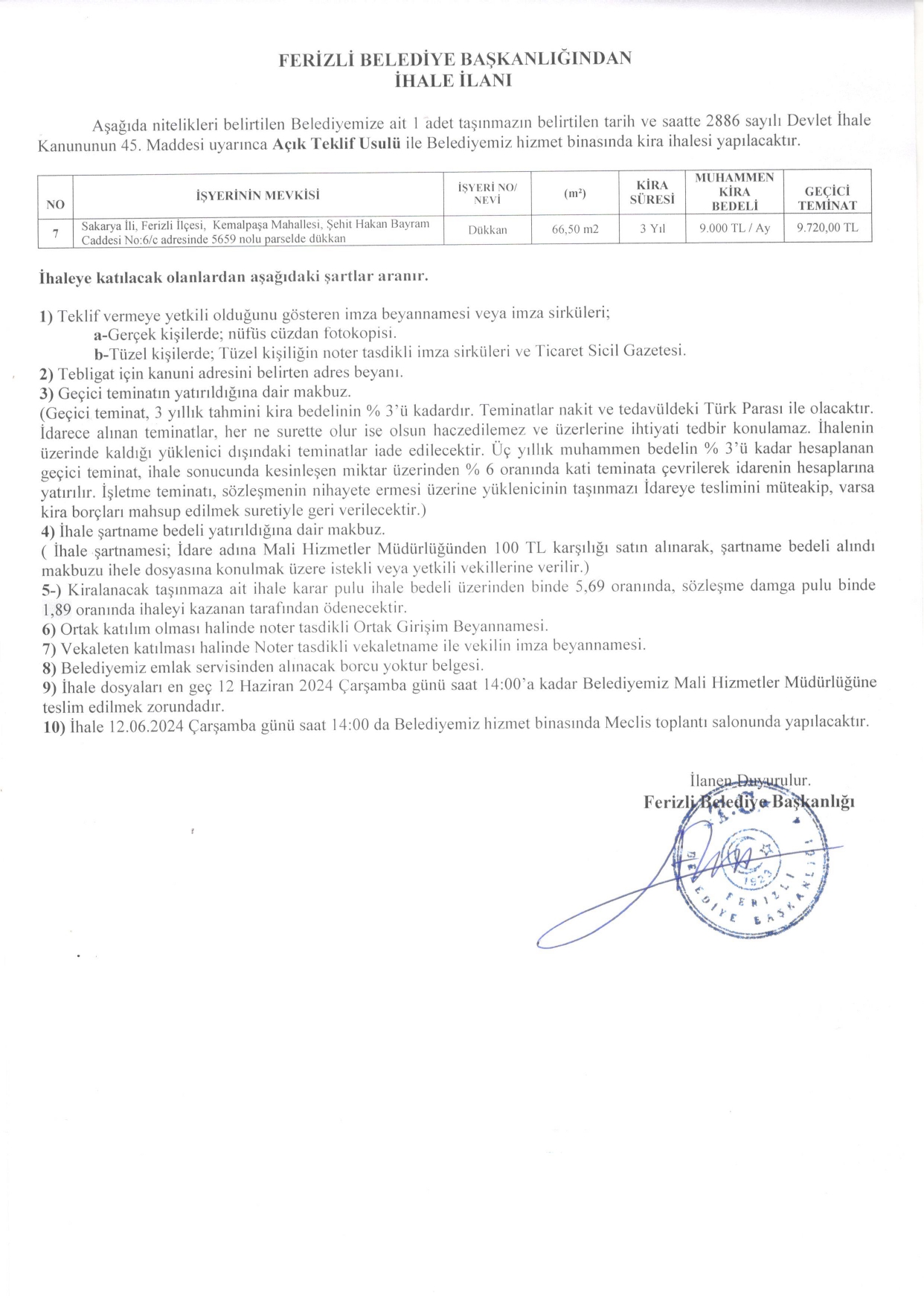 FERİZLİ BELEDİYESİ İHALE İLANI (12.06.2024)