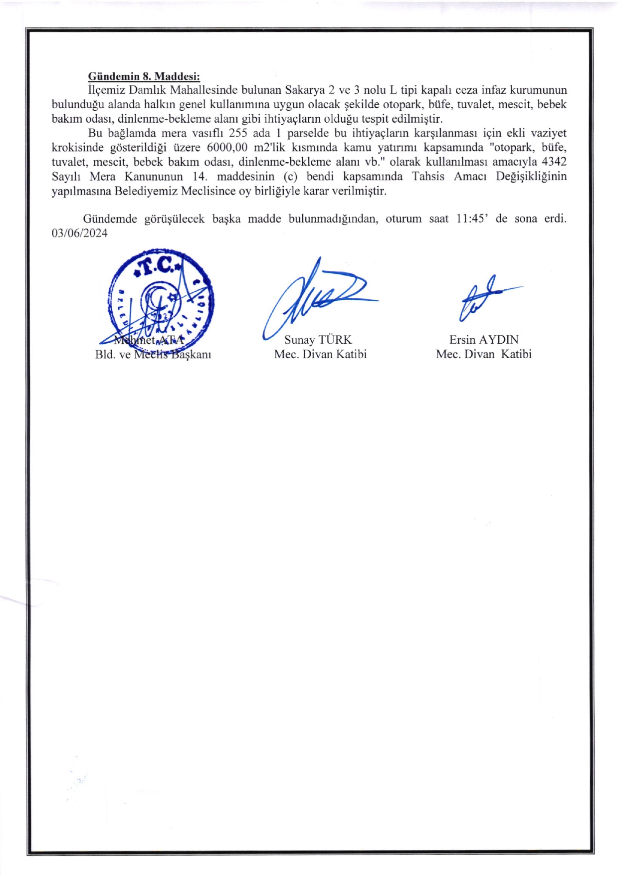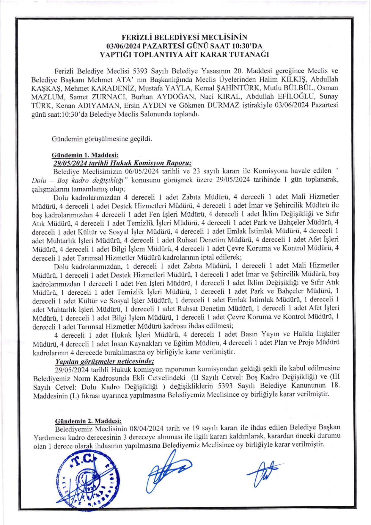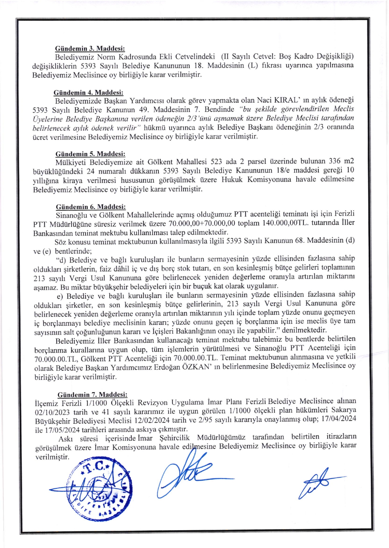 Ferizli Belediyesi Haziran Ayı Meclis Kararları (11.06.2024 Salı)