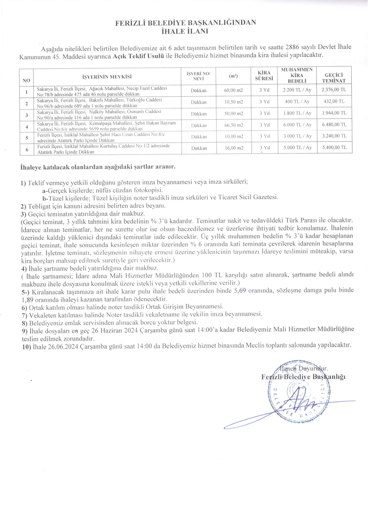 FERİZLİ BELEDİYESİ İHALE İLANI (26.06.2024)