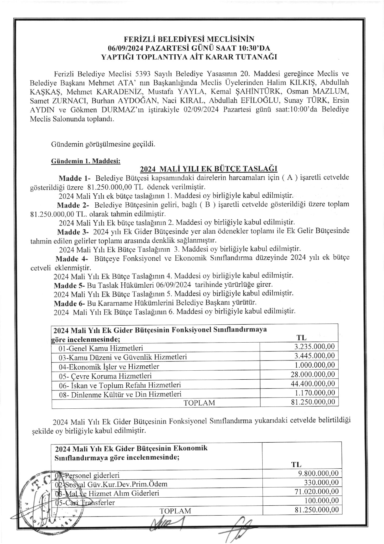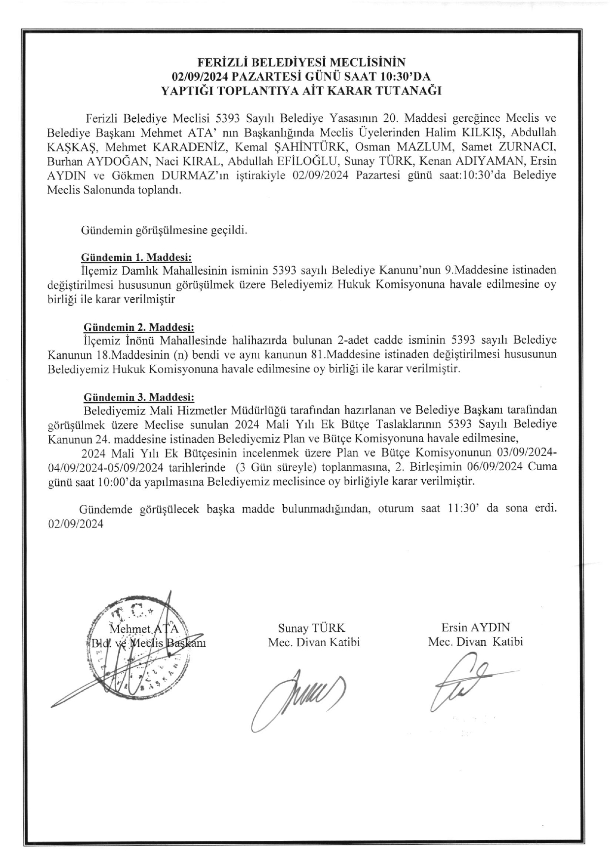 Ferizli Belediyesi Eylül Ayı Meclis Kararları (06.09.2024 Cuma) Ferizli Belediyesi Eylül Ayı Meclis Kararları (06.09.2024 Cuma) Foto Galeri için tıklayın...