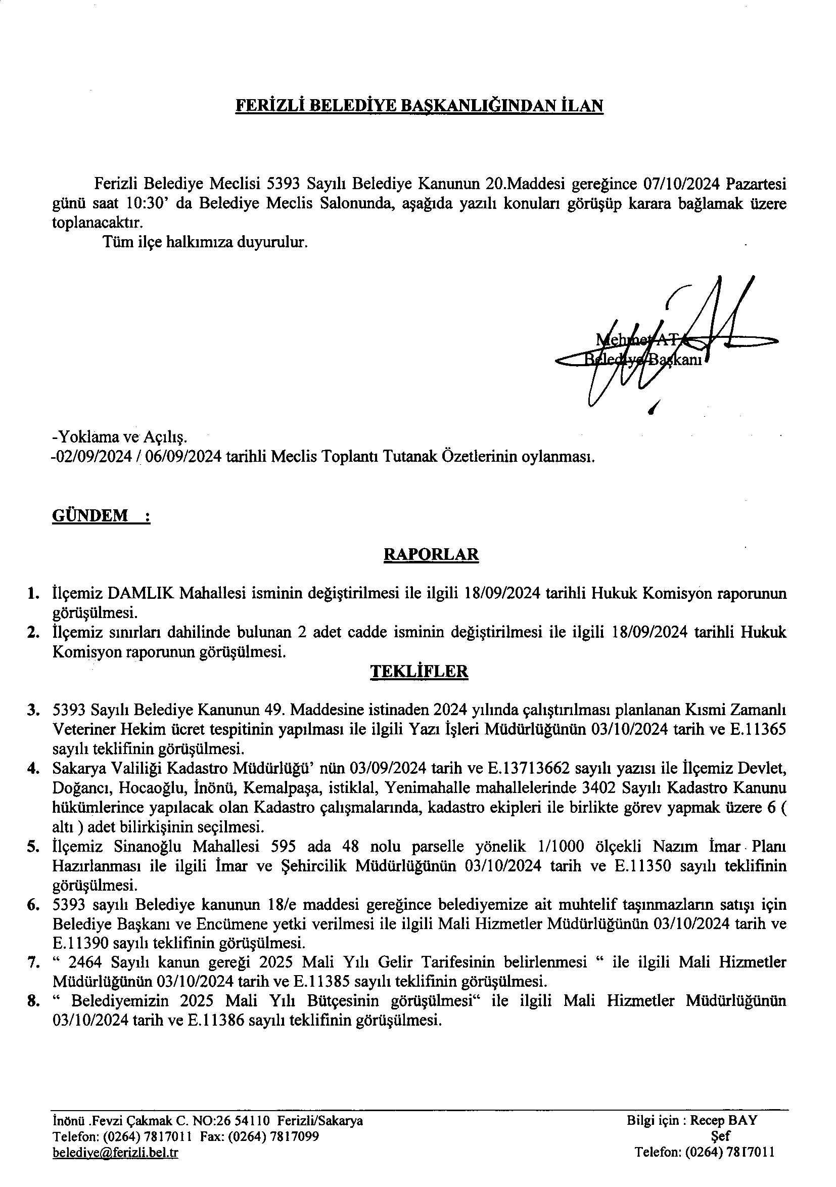 Ferizli Belediyesi Ekim Ayı Meclis Gündemi (07.10.2024 Pazartesi) Ferizli Belediyesi Ekim Ayı Meclis Gündemi (07.10.2024 Pazartesi) Foto Galeri için tıklayın...