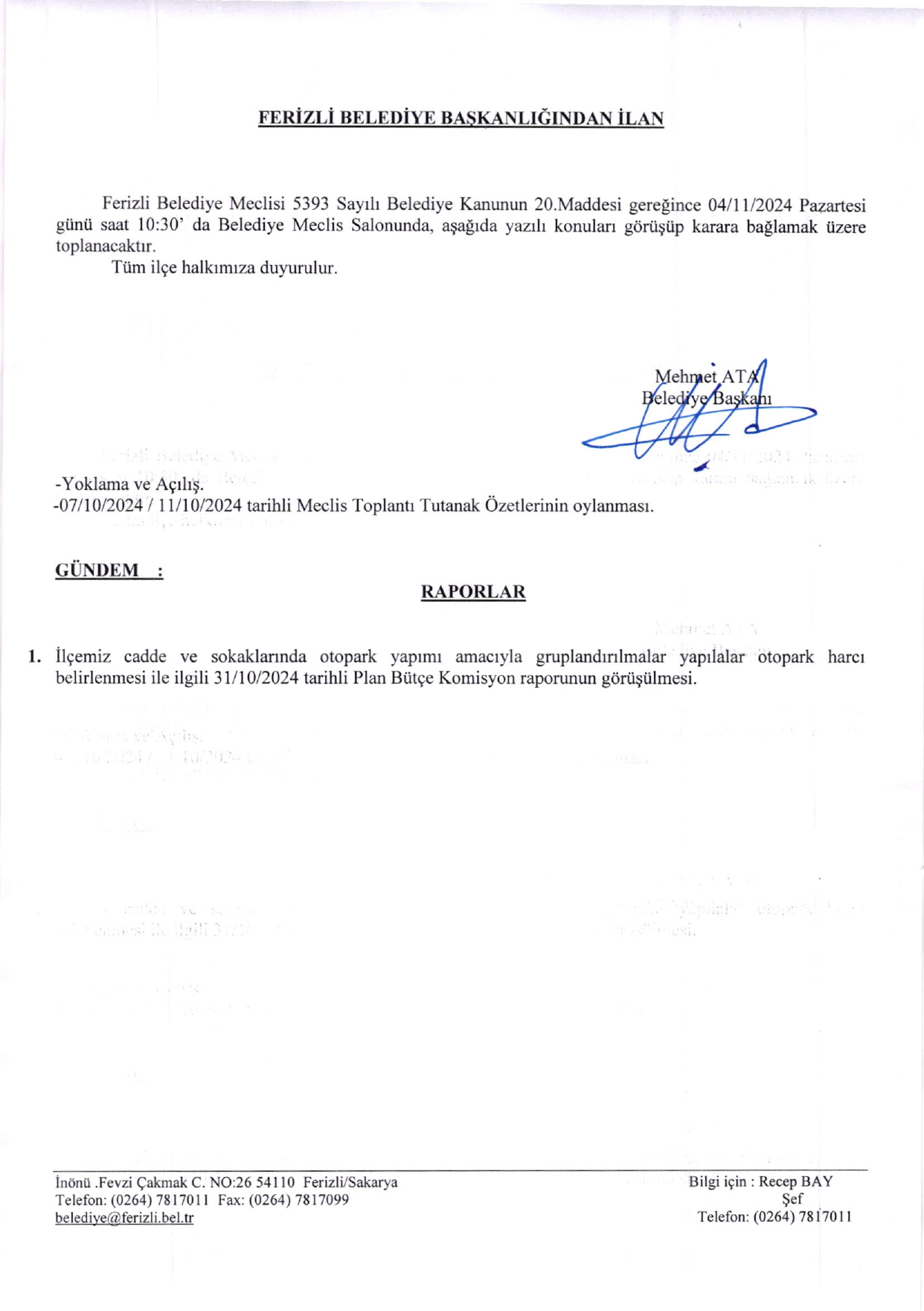 Ferizli Belediyesi Kasım Ayı Meclis Gündemi (04.11.2024 Pazartesi)