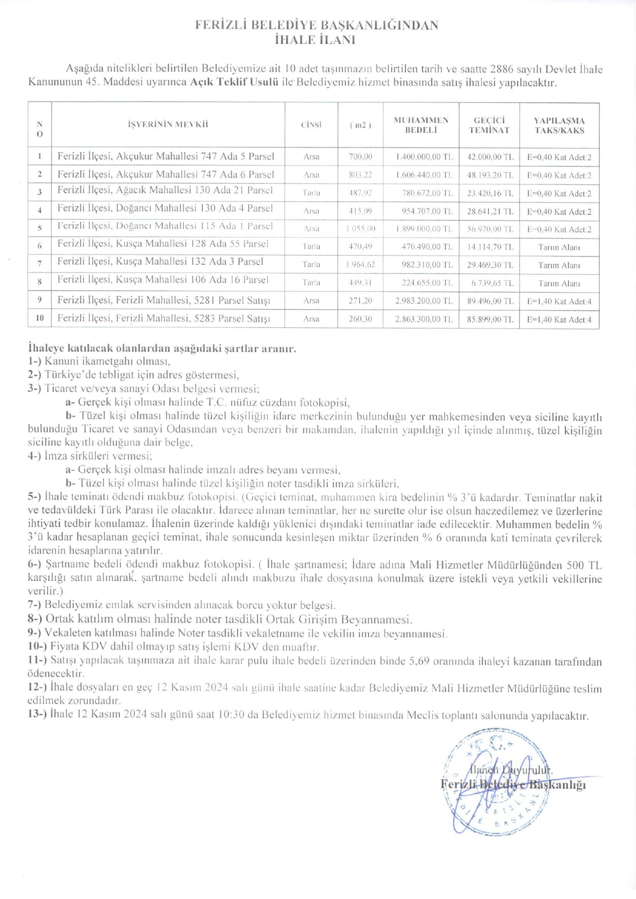 FERİZLİ BELEDİYESİ İHALE İLANI (12.11.2024)