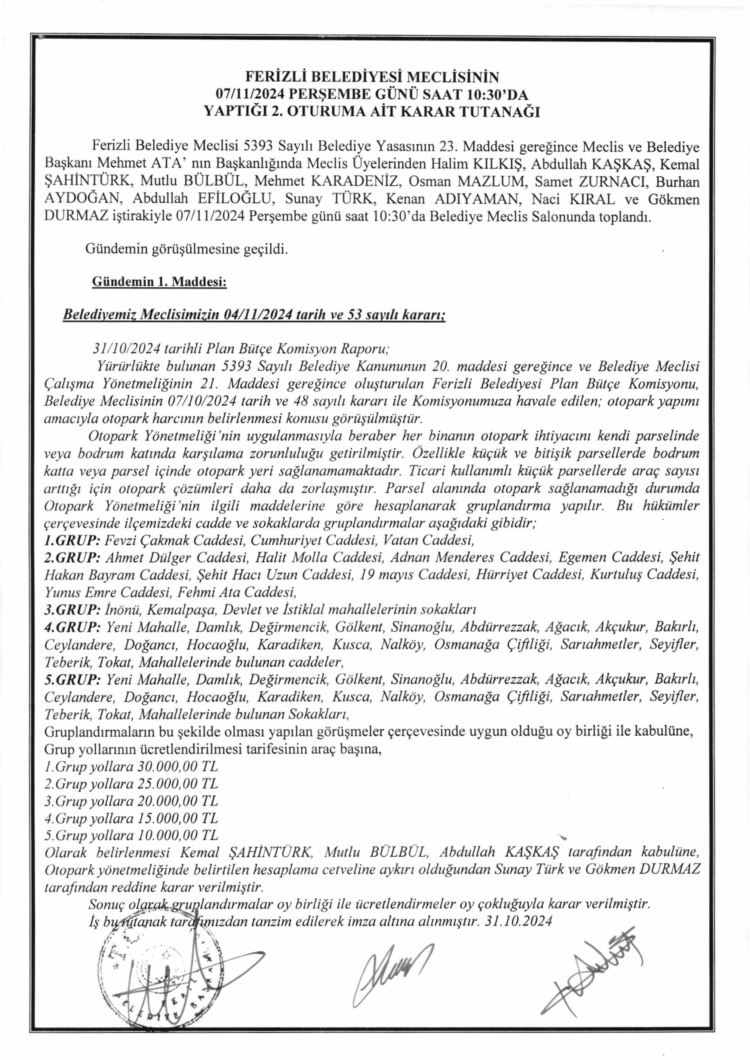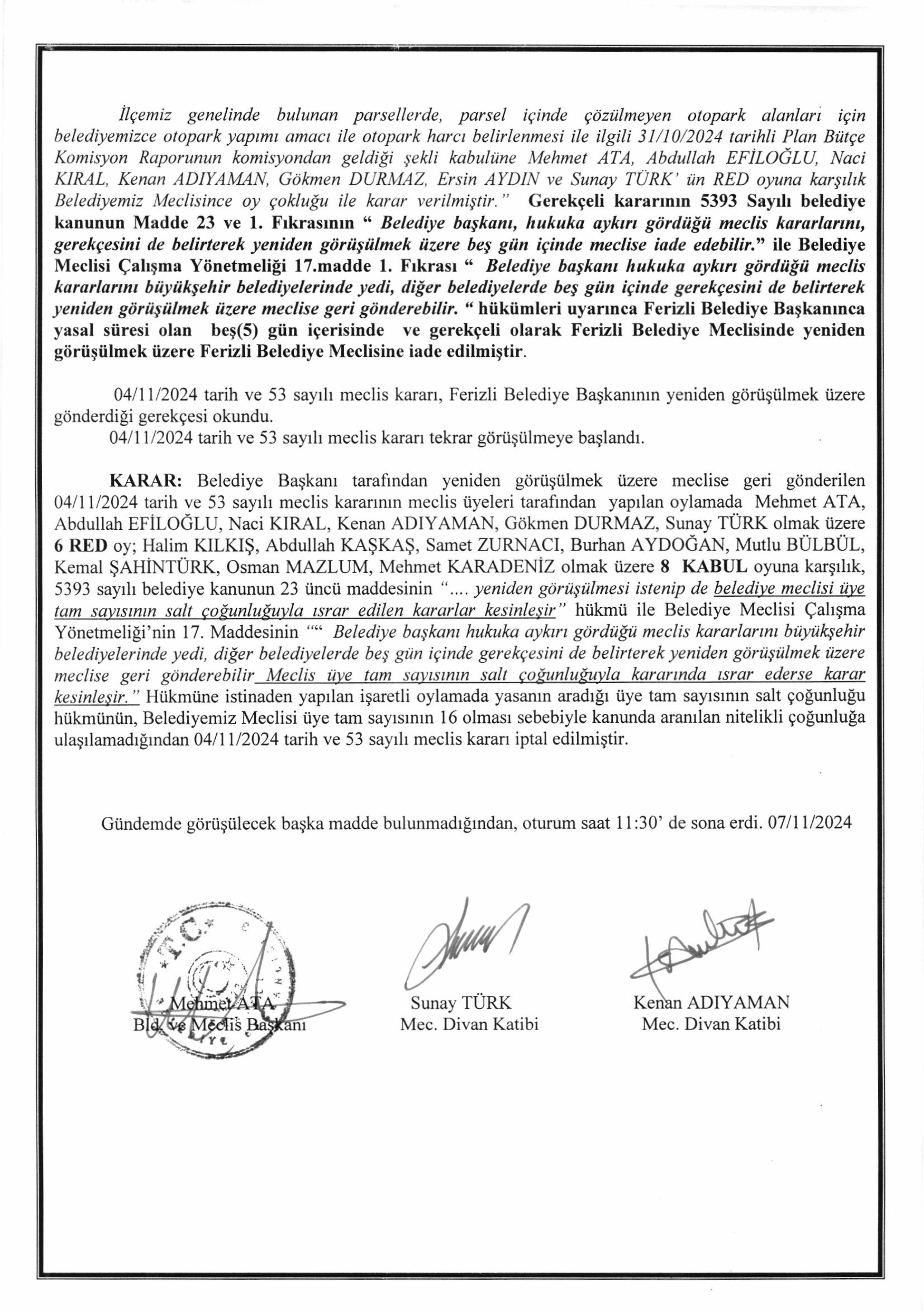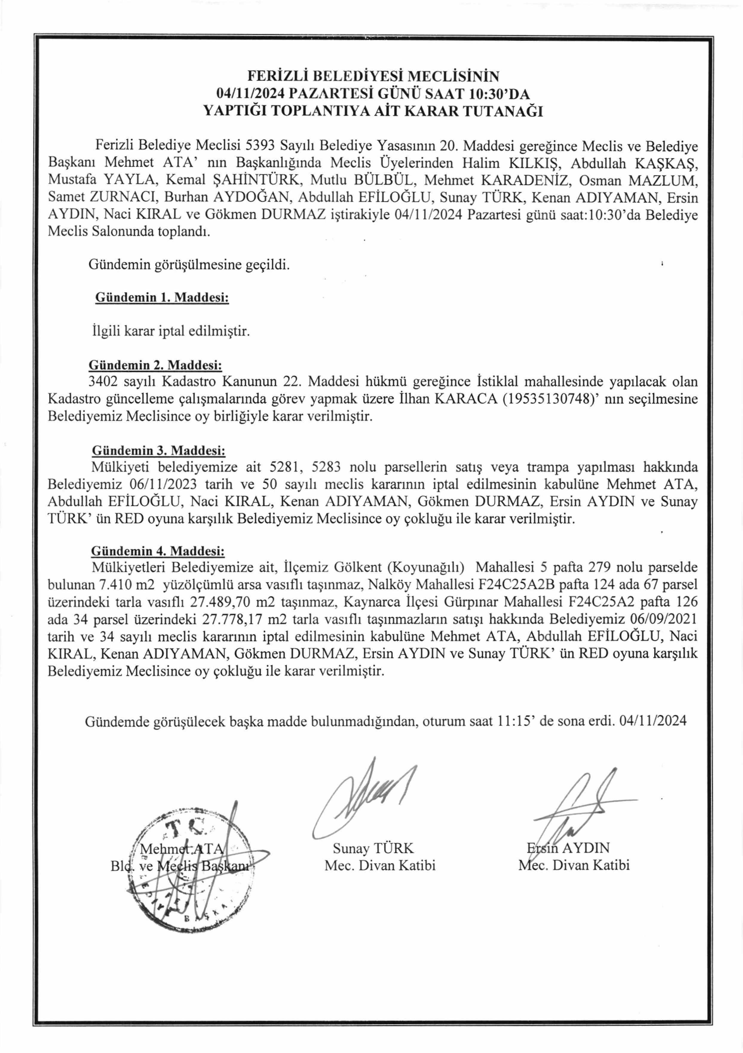 Ferizli Belediyesi Kasım Ayı Meclis Kararları (07.11.2024 Pazartesi)