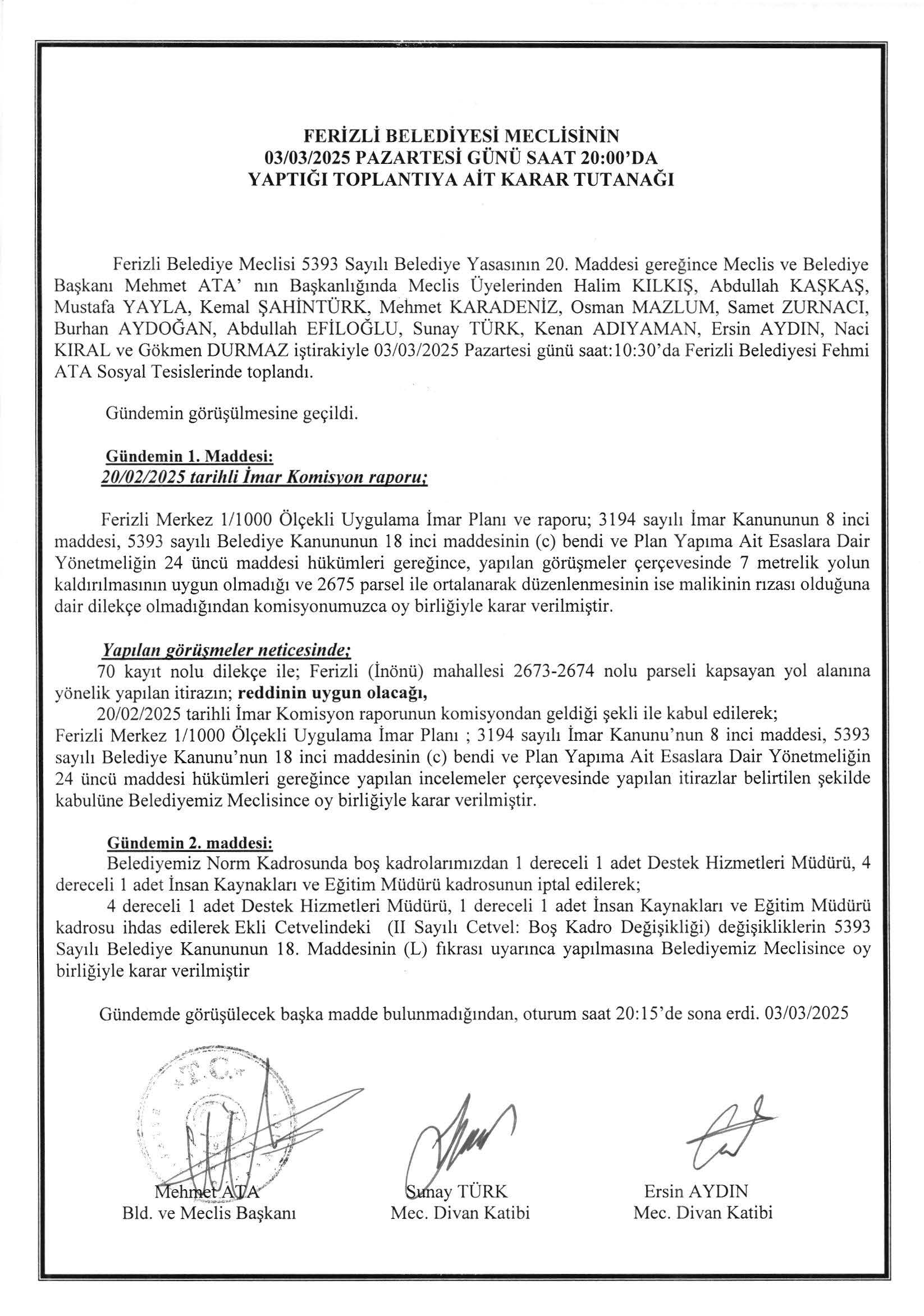 Ferizli Belediyesi Mart Ayı Meclis Kararları (03.03.2025 Pazartesi)